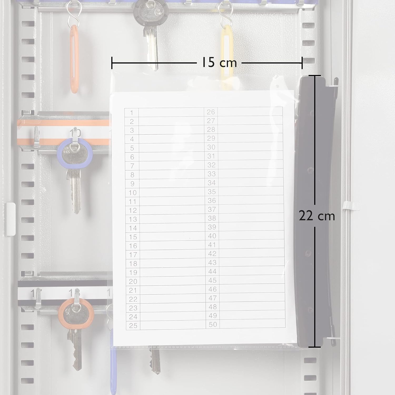 - Gefertigt aus robustem, pulverbeschichtetem Stahlblech. Ausgestattet mit verstellbaren Hakenleisten (nummeriert) und schwenkbarem schlüsselregister