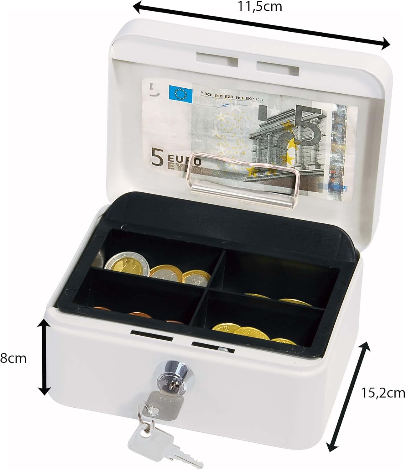 - Mit versenkbarem Tragegriff, Münzeinsatz aus Kunststoff mit 4 Fächern sowie Sicherheits-Zylinderschloss mit 2 Schlüsseln ausgestattet