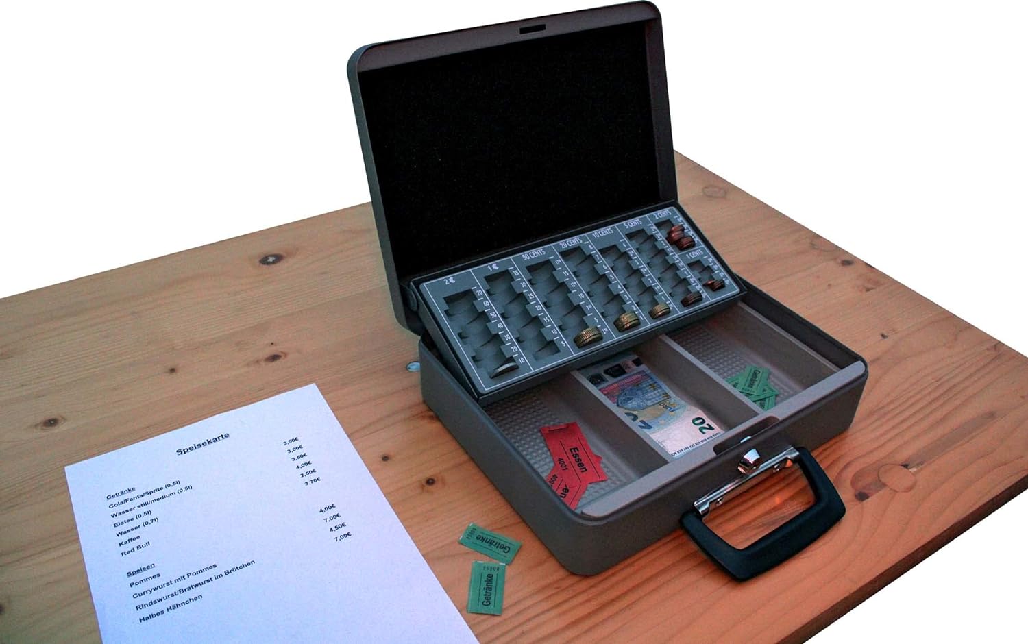 - der Hartgeldeinsatz gleitet beim Öffnen des Koffers automatisch nach hinten, das Münzgeld wird durch den Schaumstoffeinsatz im Deckel beim Transport fixiert