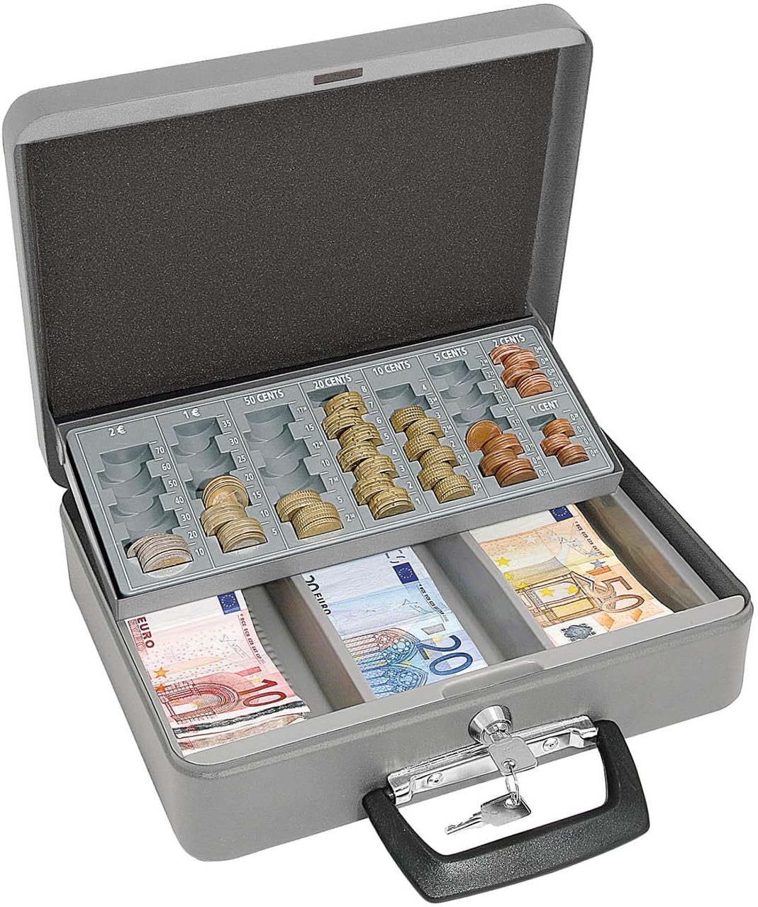 - mit einem Zylindersicherheitsschloss und 2 Schlüsseln ausgestattet, Fassungsvermögen Euro 137,60 Hartgeld