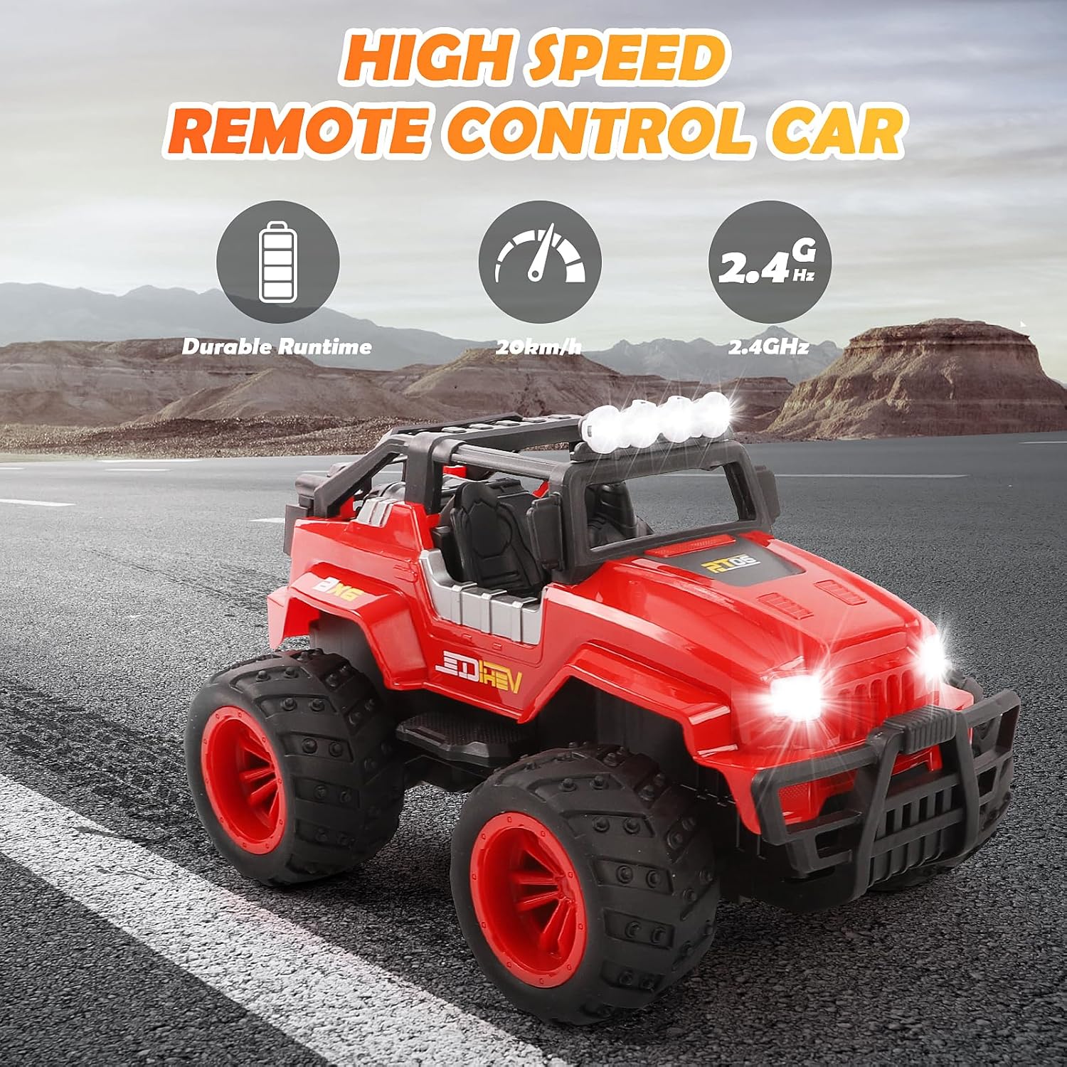 - Hochwertiger Ferngesteuertes Auto: Die Karosserie des RC auto besteht aus hochwertigem ABS-Material, das ungiftig, geruchlos, sicher und umweltfreundlich ist. Er verfügt über rutschfeste TPR-Reifen, sodass er problemlos auf Sand, Gras, Schlamm,