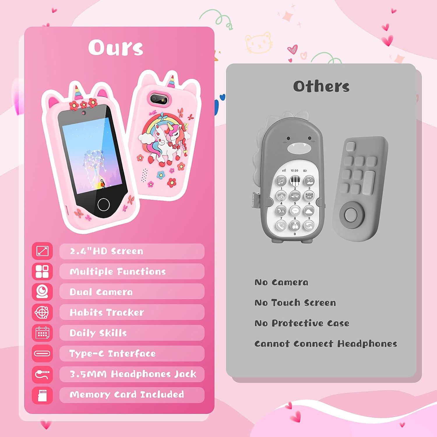 • 🦄【Einhorn Kinder-Multifunktions-Smartphone】 Dieses Kinder-Handy mit 2,4-Zoll-HD-Bildschirm ist mit mehreren Funktionen wie Kamera, MP3-Musik-Player, Video-Player, Dual-Kameras, Mini-Spiele, Wecker, Taschenlampe, Taschenrechner, Kalender und