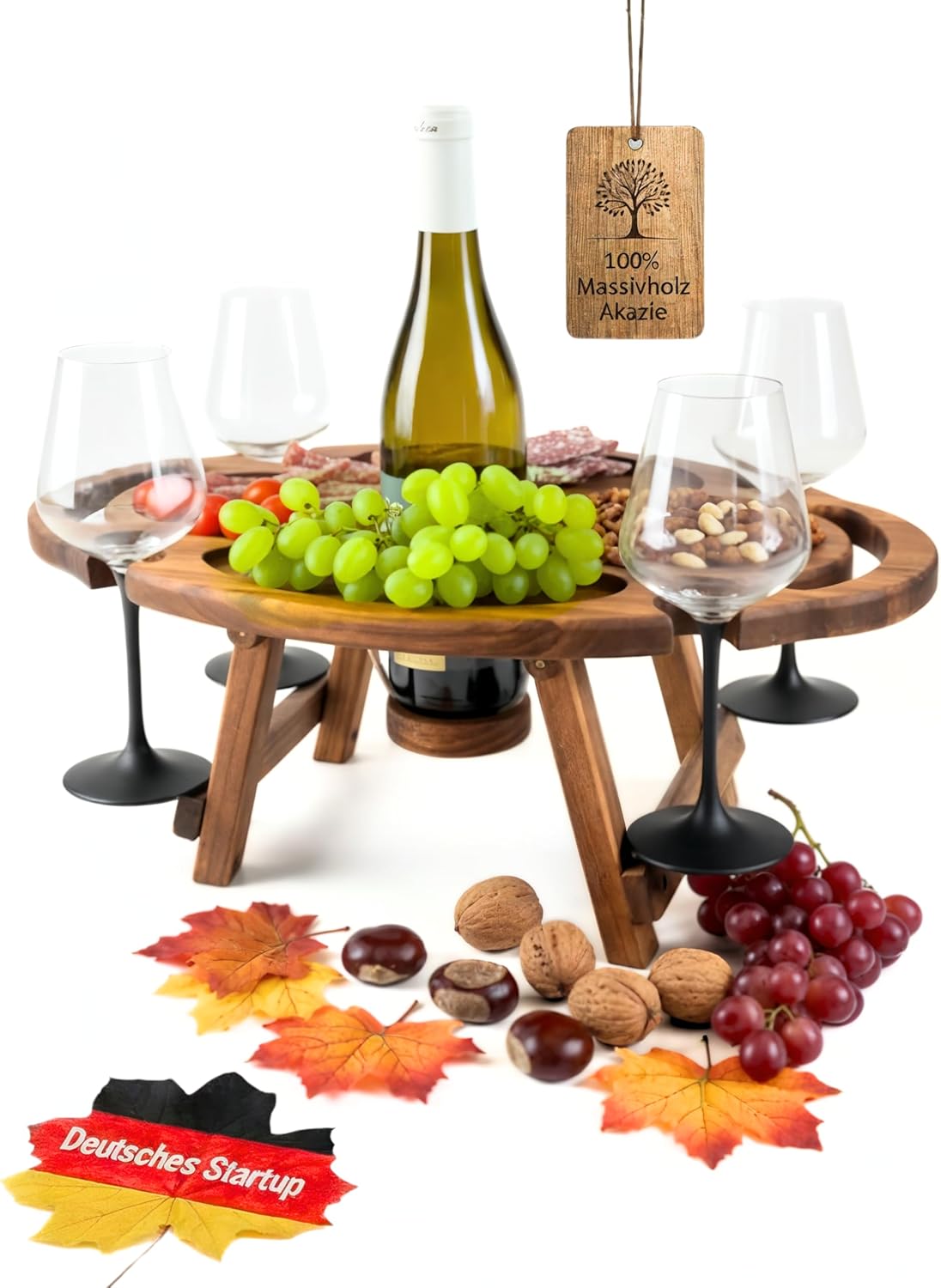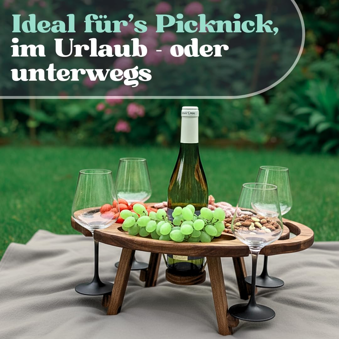 - FALTBARER PICKNICKTISCH FÜR UNTERWEGS - Tragbarer Picknick Weintisch für Picnic oder Ausflüge. Leicht zu transportieren, bietet der Picknicktisch mit Weinhalterung Platz für Weinflaschen und Gläser – ideal als Geschenke für Camper.
