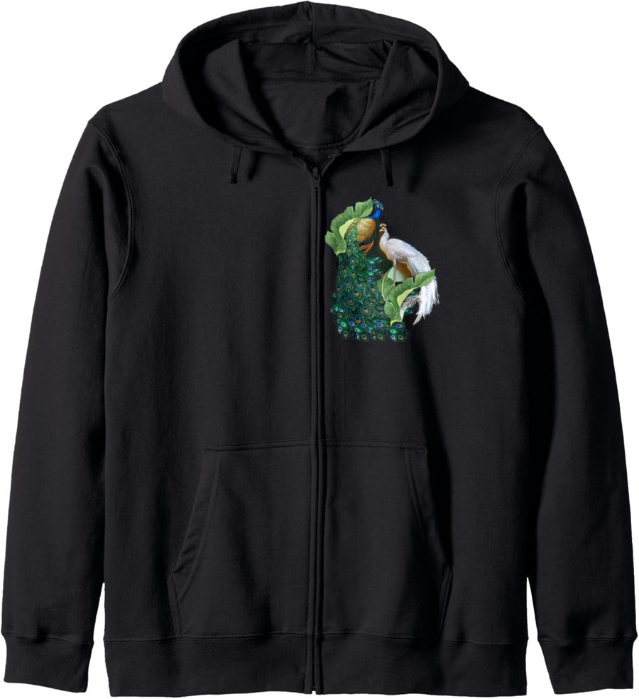 PRODUKTBESCHREIBUNGEN Zwei kaiserliche Pfauen mit schmalen Hälsen, die in einem langen, extravaganten Zierschwanz aus beeindruckenden Federn enden, die sich um tropisch grüne Blätter kräuseln. Mehr