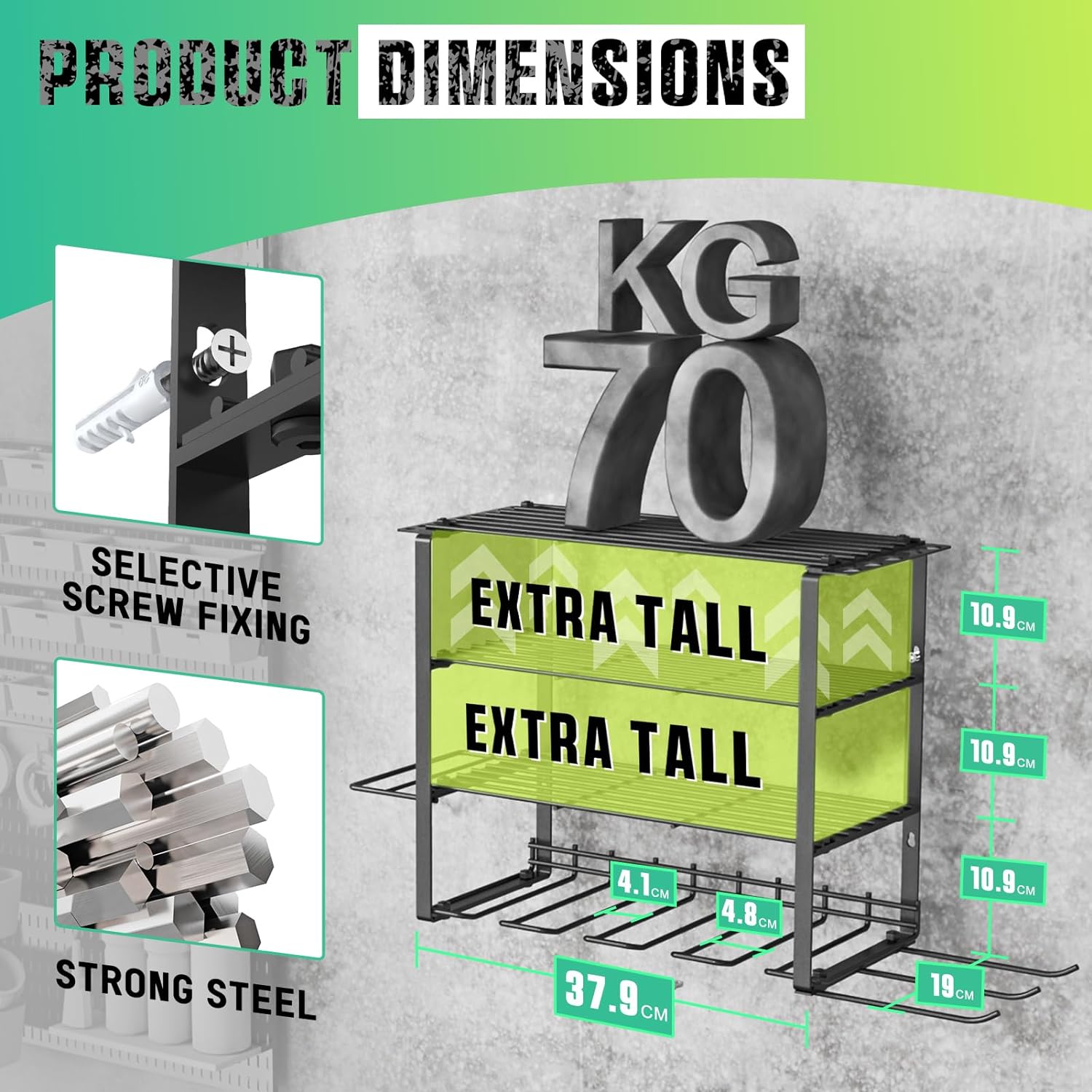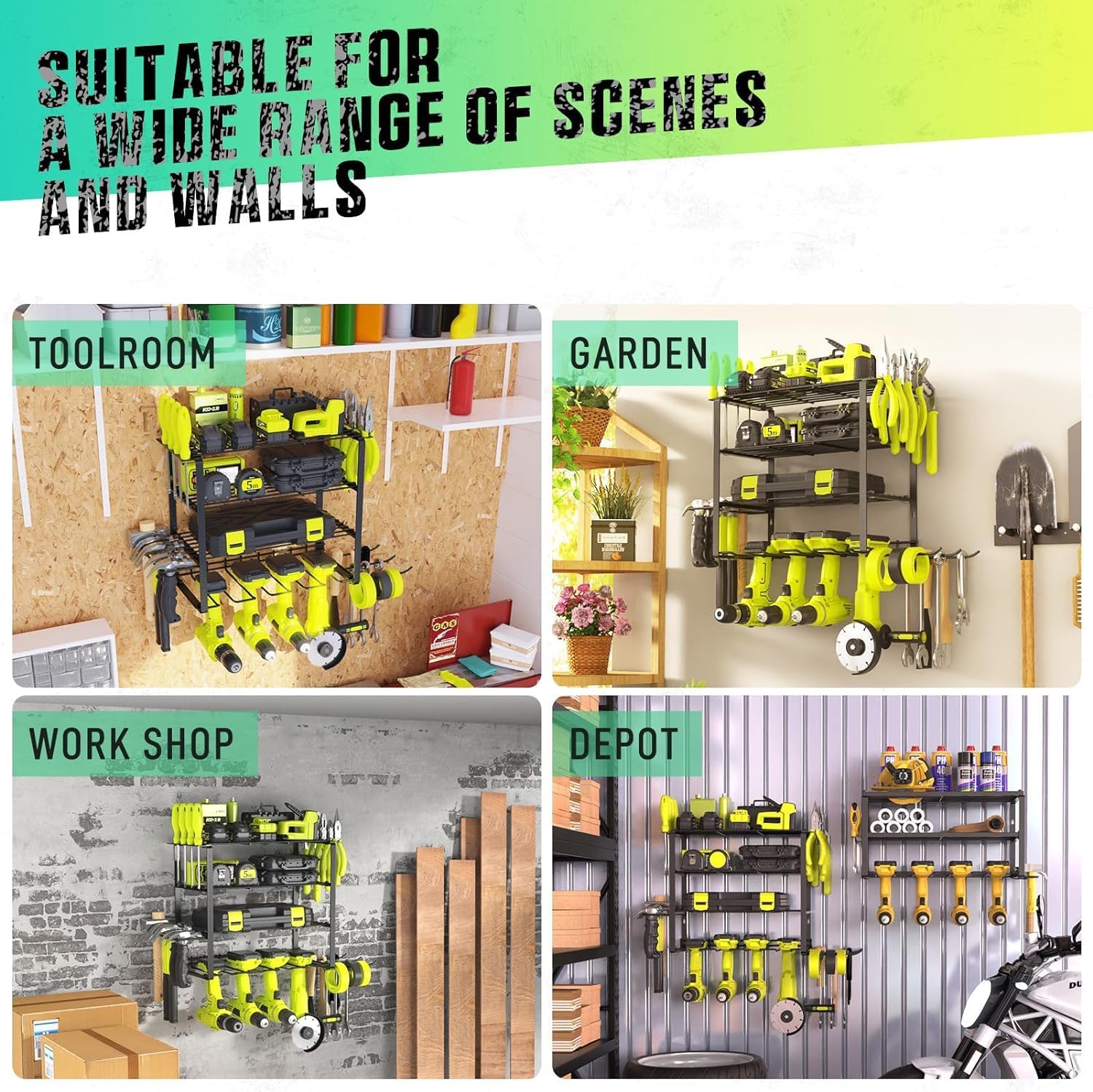 • Hohe Belastung: Dieser Bohrhalter kann bis zu 60 kg Gewicht tragen. 4 Steckplätze sind ideal für die Aufbewahrung von Elektro-Bohrmaschinen, 2 Etagen für Kreissäge, grosse Hammer oder grosse Werkzeugkisten.