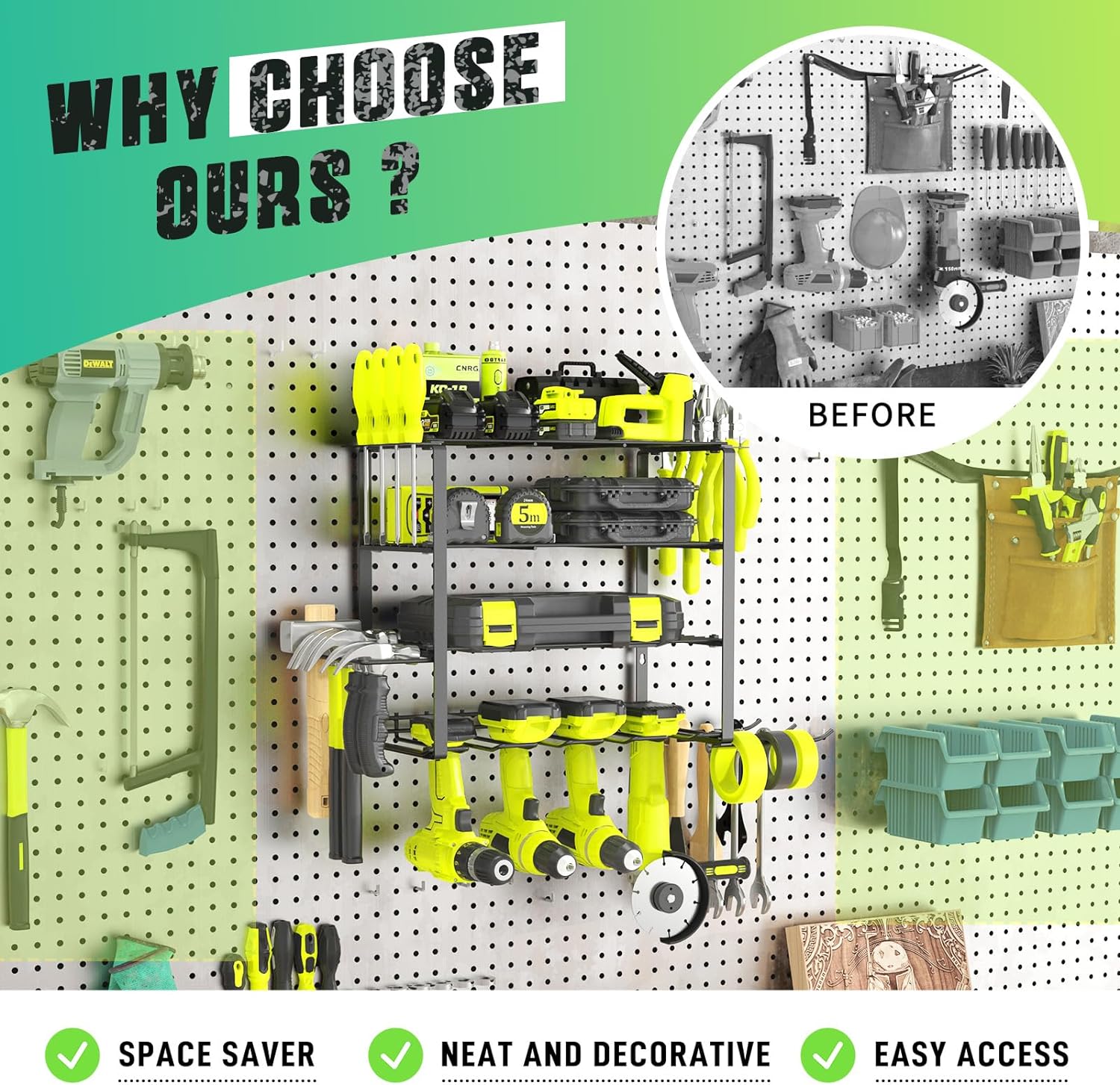 • Langlebigkeit: Unsere Elektrowerkzeug Organizer besteht aus hochbelastbarem legiertem Stahl und Galvanisierungsprozess und ist robust und langlebig.