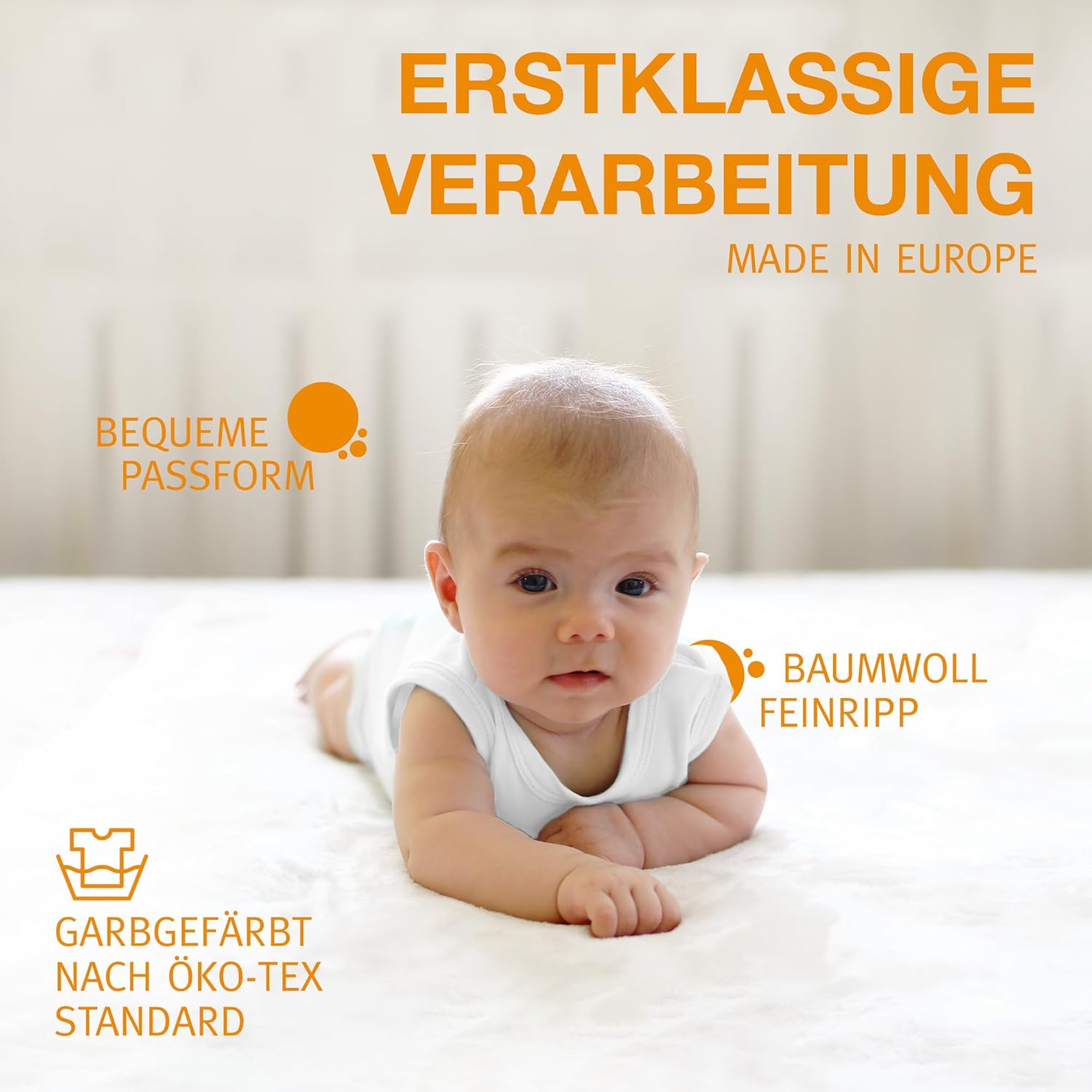- 100% BAUMWOLLE: Unsere Bodys sind aus 100% super weicher Baumwolle (Feinripp mit 210 g/qm) gefertigt und haben im Schritt drei nickelfreie Druckknöpfe zum schnellen Auf- und Zumachen. Deshalb sind sie besonders hautsympathisch und auch für Kinder
