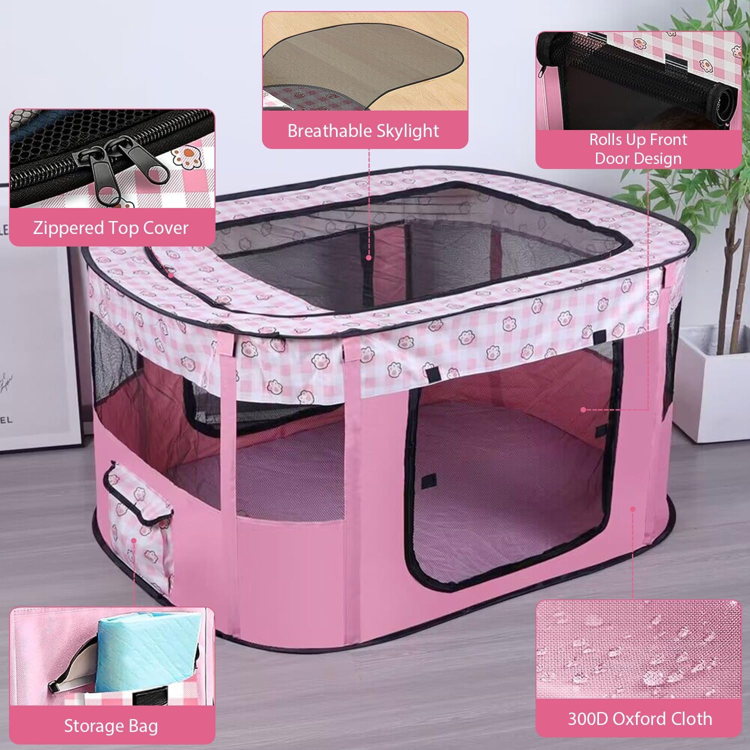 - 【Faltbares Design】 Das faltbare Design des Haustierzauns erleichtert die Aufbewahrung und den Transport und eignet sich für den Innen- und Aussenbereich. Der Türvorhang ist mit Reissverschlüssen und Klettverschluss ausgestattet, die sich leicht