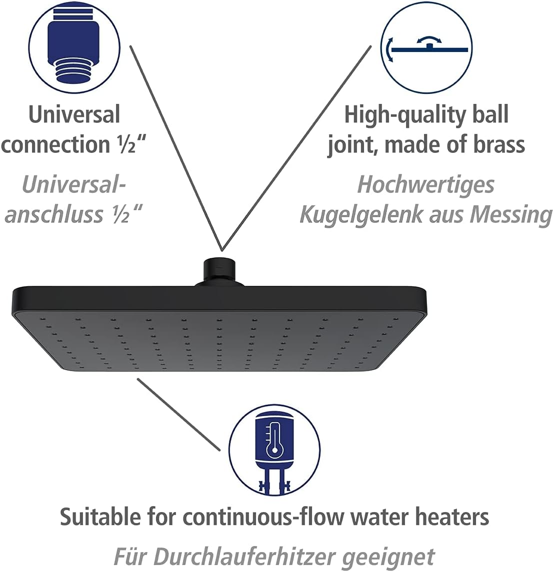• Einer für alle: Der komfortable Regenduschkopf verfügt über einen Universalanschluss mit ½“ und ist natürlich auch für Durchlauferhitzer geeignet. Der schwarze Brause-Kopf überzeugt durch Funktionalität, Design & Qualität.