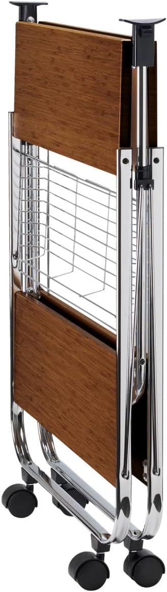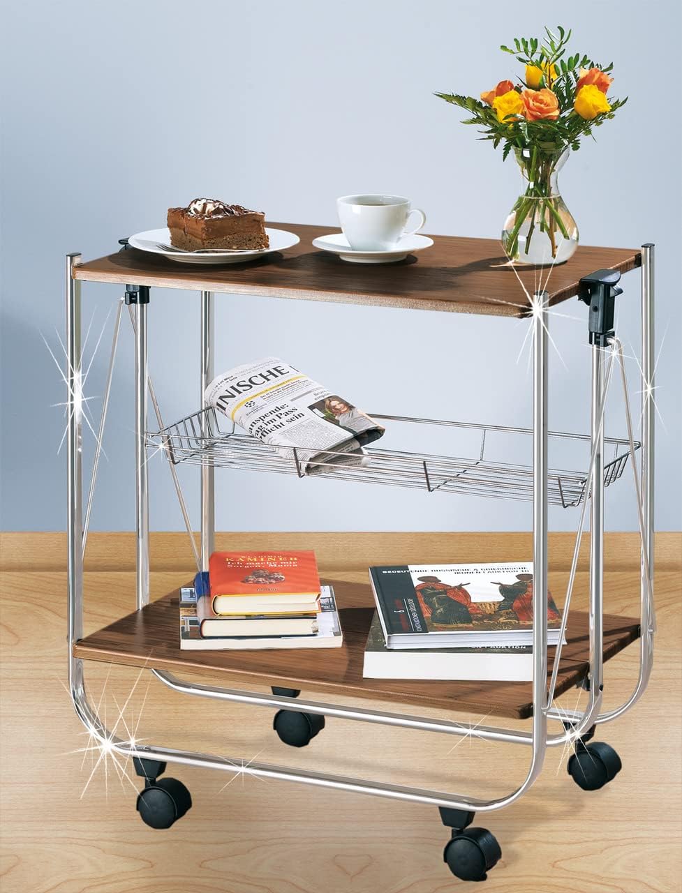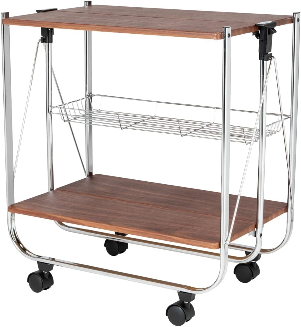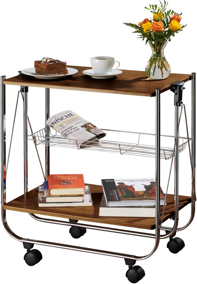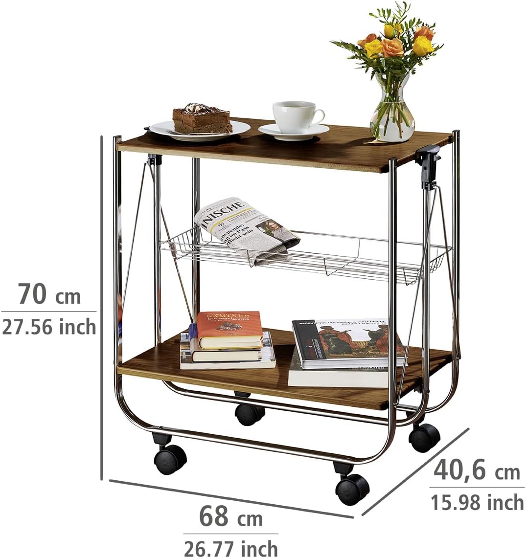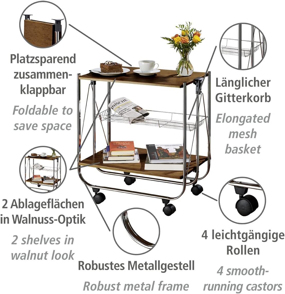 - Robustes Metallgestell mit MDF-Platte in Nussbaum-Optik und vier Leichtlaufrollen