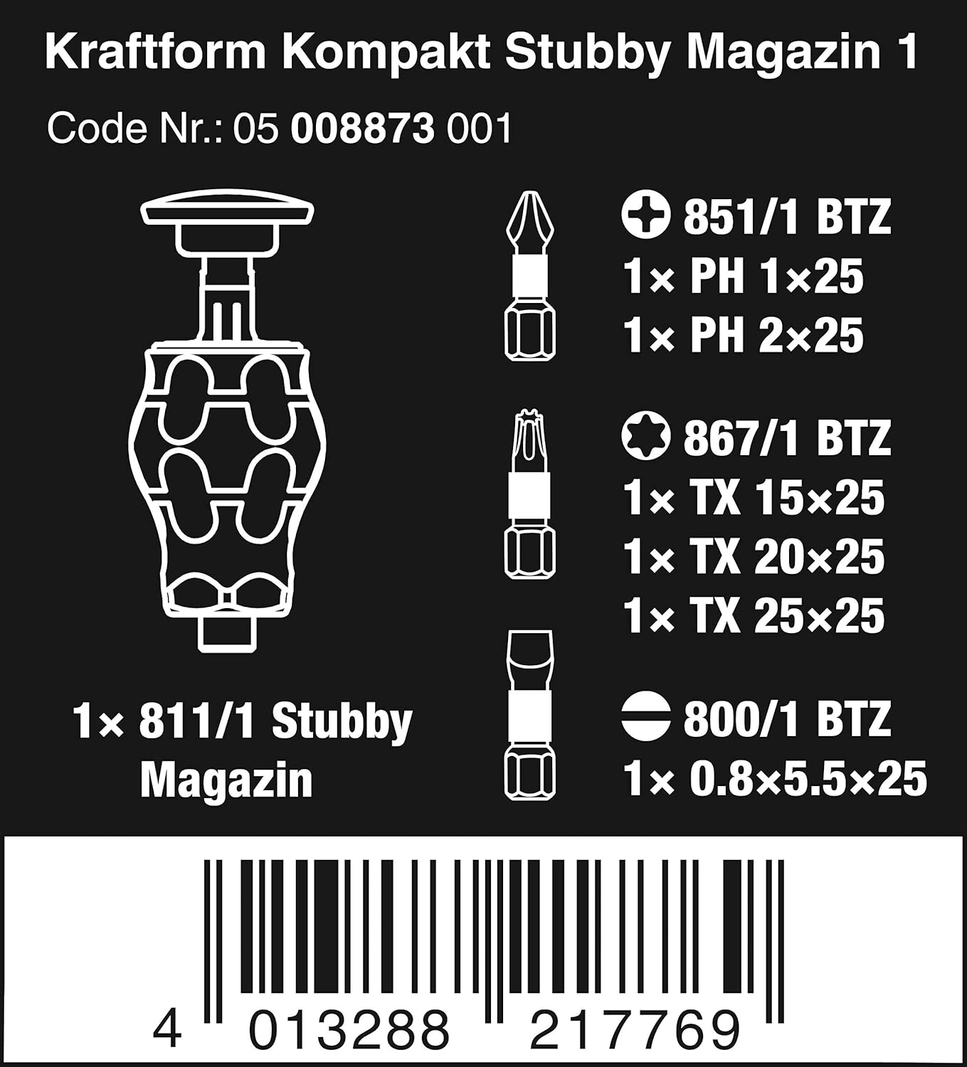 - Produkt 1: Kurze kompakte Stubby-Form für Arbeiten in engen Bauräumen mit 6 Bits im integrierten Magazin