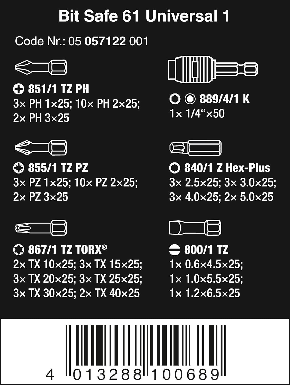 Wera Bit-Sortiment, Bit-Safe 61 Universal 1, 60-teilig, 05057122001