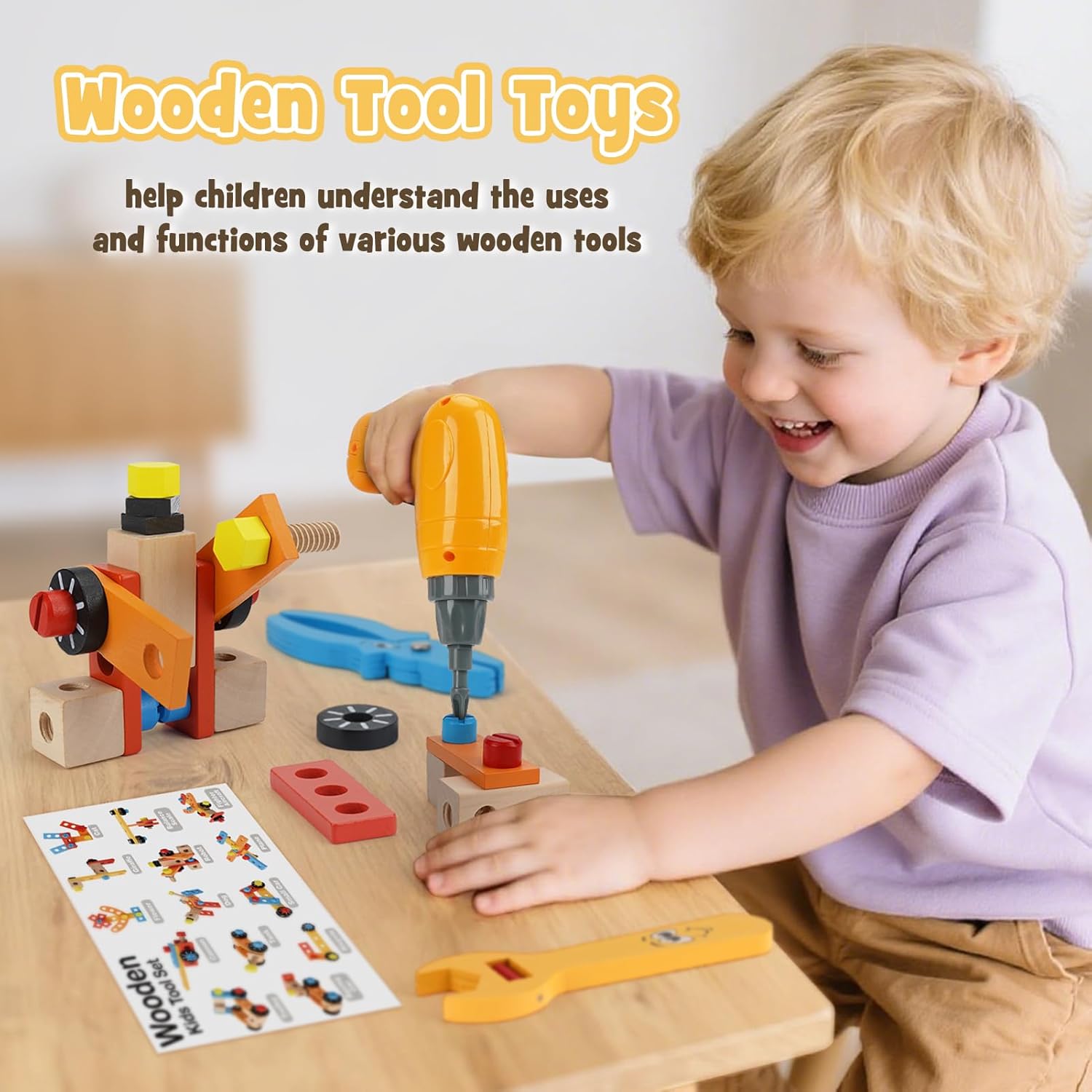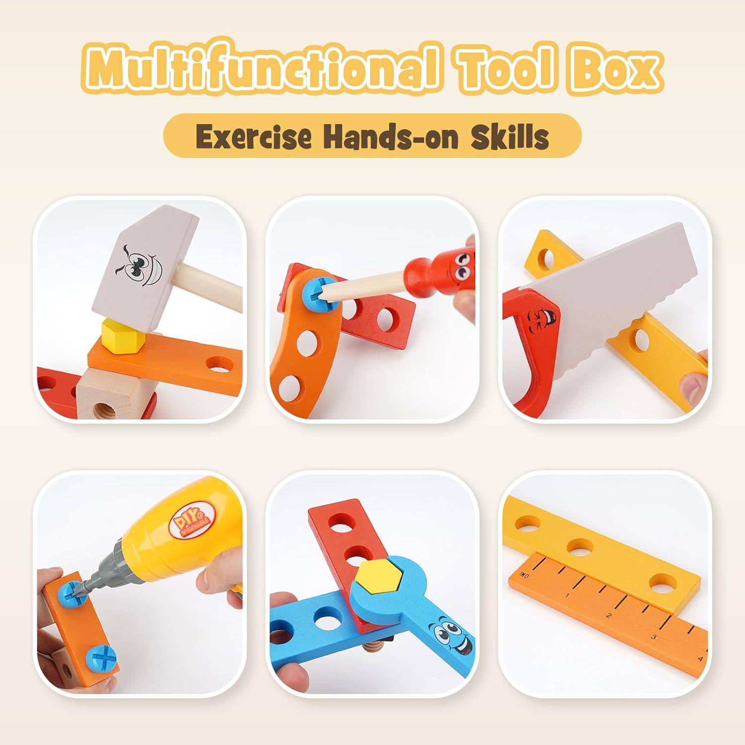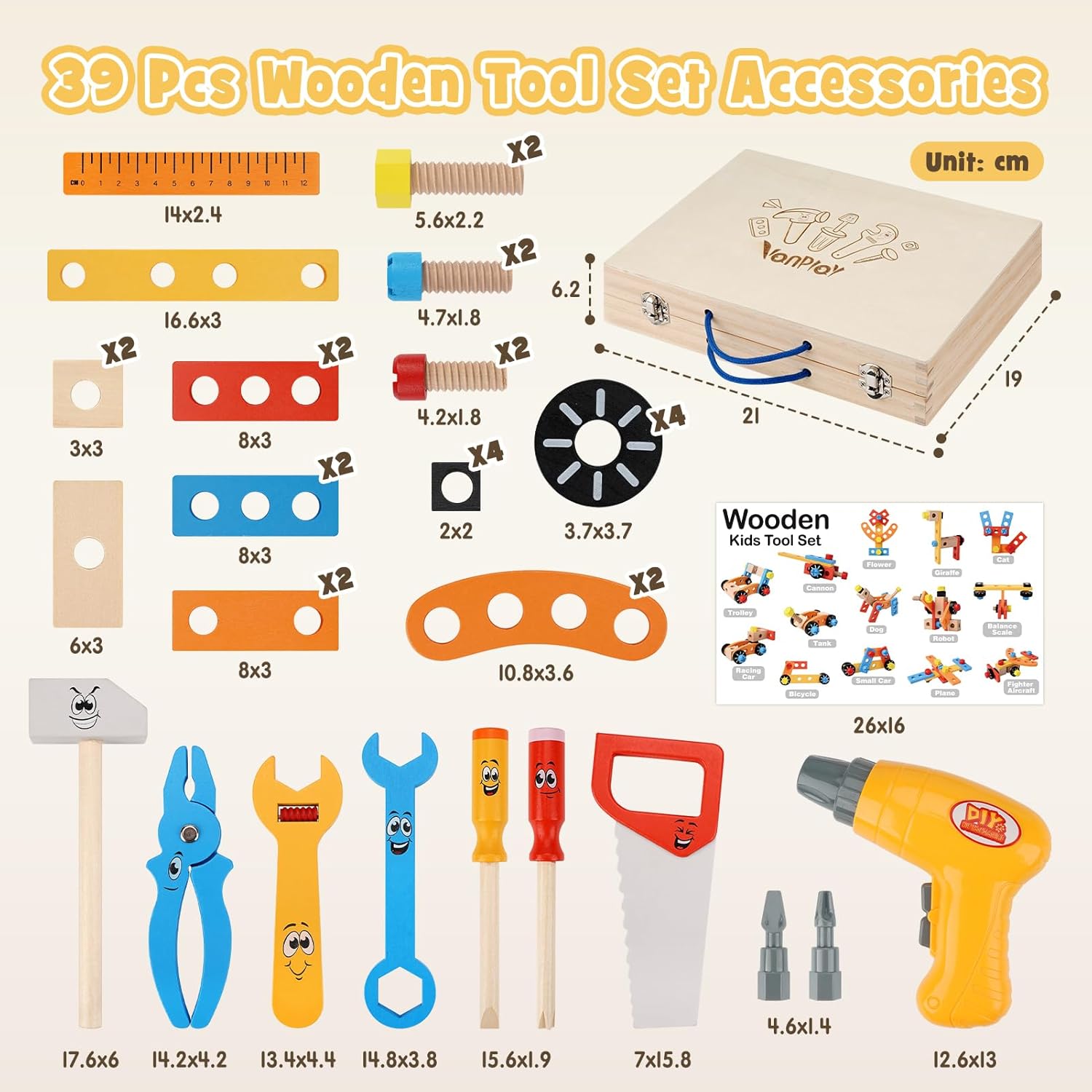 • Holzspielzeug ab 3 Jahre:Eine grosse Auswahl an realistischen Werkzeugen, die die Fantasie anregen! Kinder können Heimwerkerarbeiten nachahmen und durch lustige Spielszenarien wie das Reparieren von Spielzeug oder das Helfen ihrer Eltern