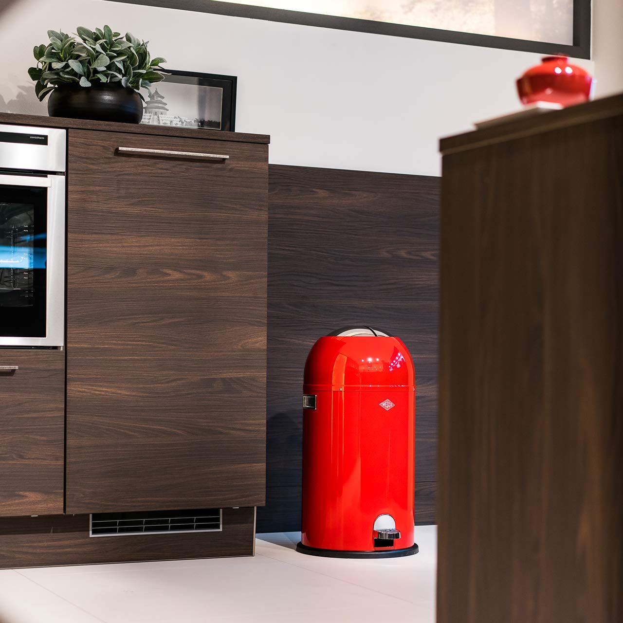• Das Besondere: Die Öffnung oben. Sie schliesst geruchs- und geräuscharm dank eingebautem Dämpfer und wird über eine robuste Tretmechanik bedient.