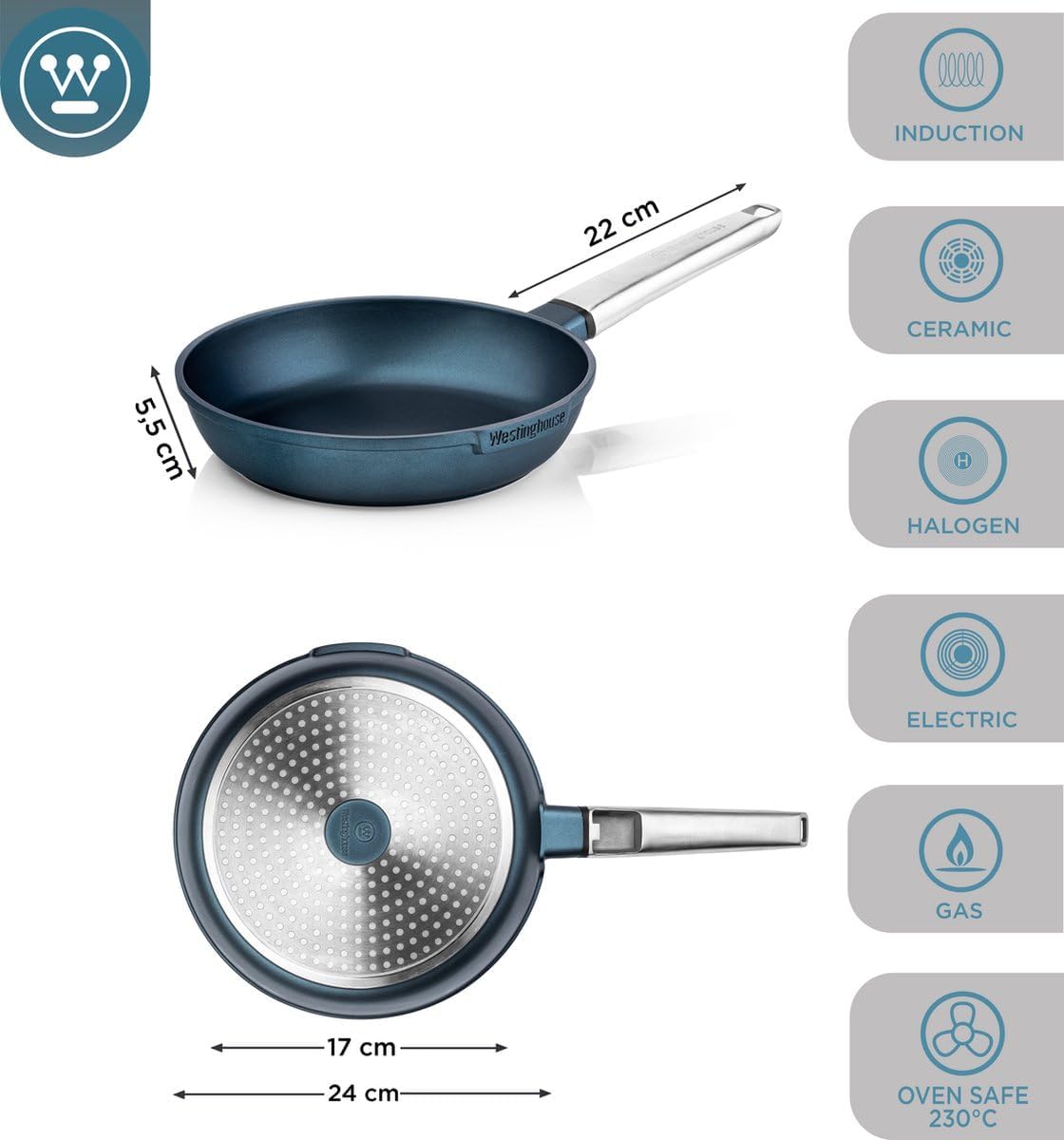 - UNIVERSAL: Die Westinghouse Pfannen sind extrem anpassbar und eigenen sich für jeden erdenklichen Verwendungszweck, so können sie die Pfanne auf Gas-, Elektro-, Halogen-, Keramik- und Induktionskochfelder sorglos verwenden