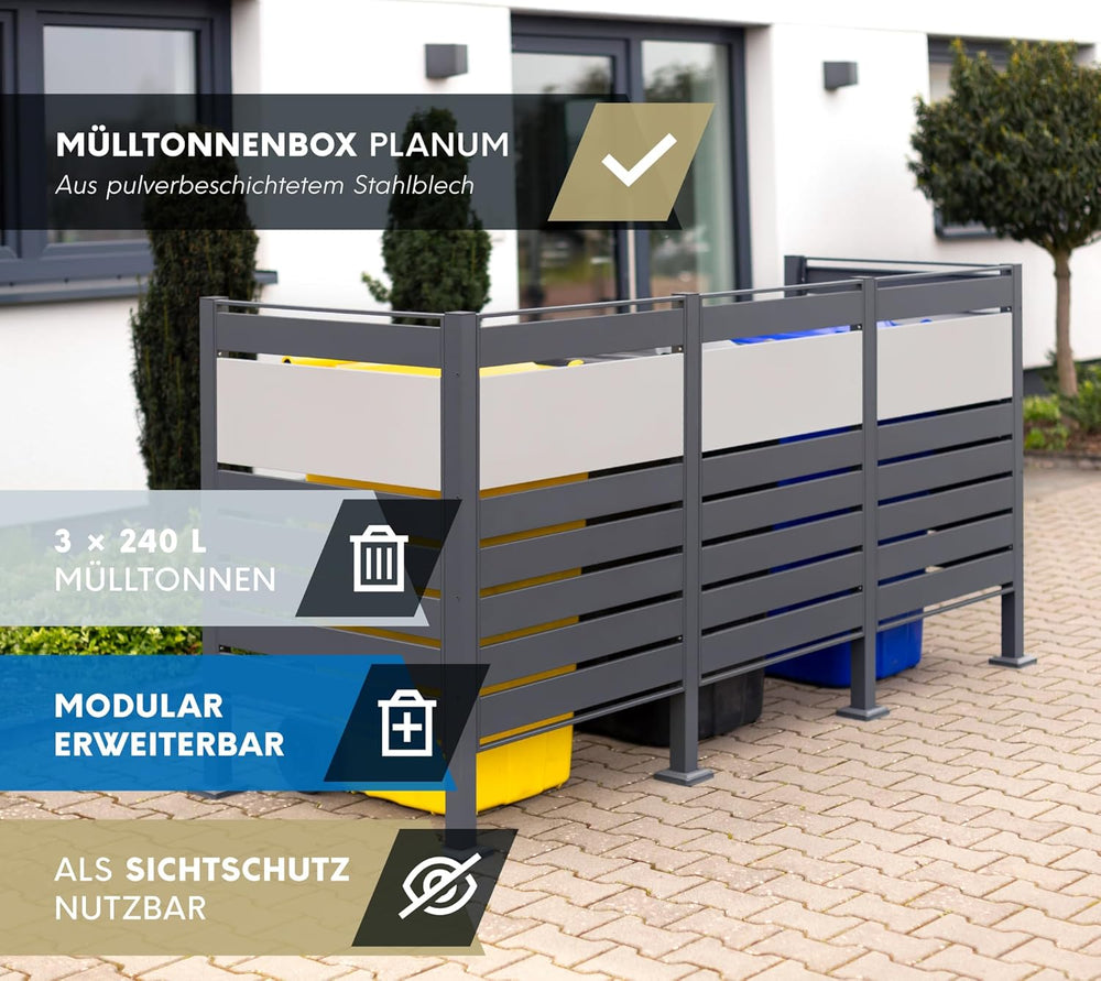 - ABMESSUNGEN: Das Aussenmass der Mülltonnenverkleidung beträgt 240x80x120 cm und bietet Platz für 3 Mülltonnen (3x 240 Liter). Der Mülltonnen Sichtschutz Planum vom WESTMANN ist modular erweiterbar!