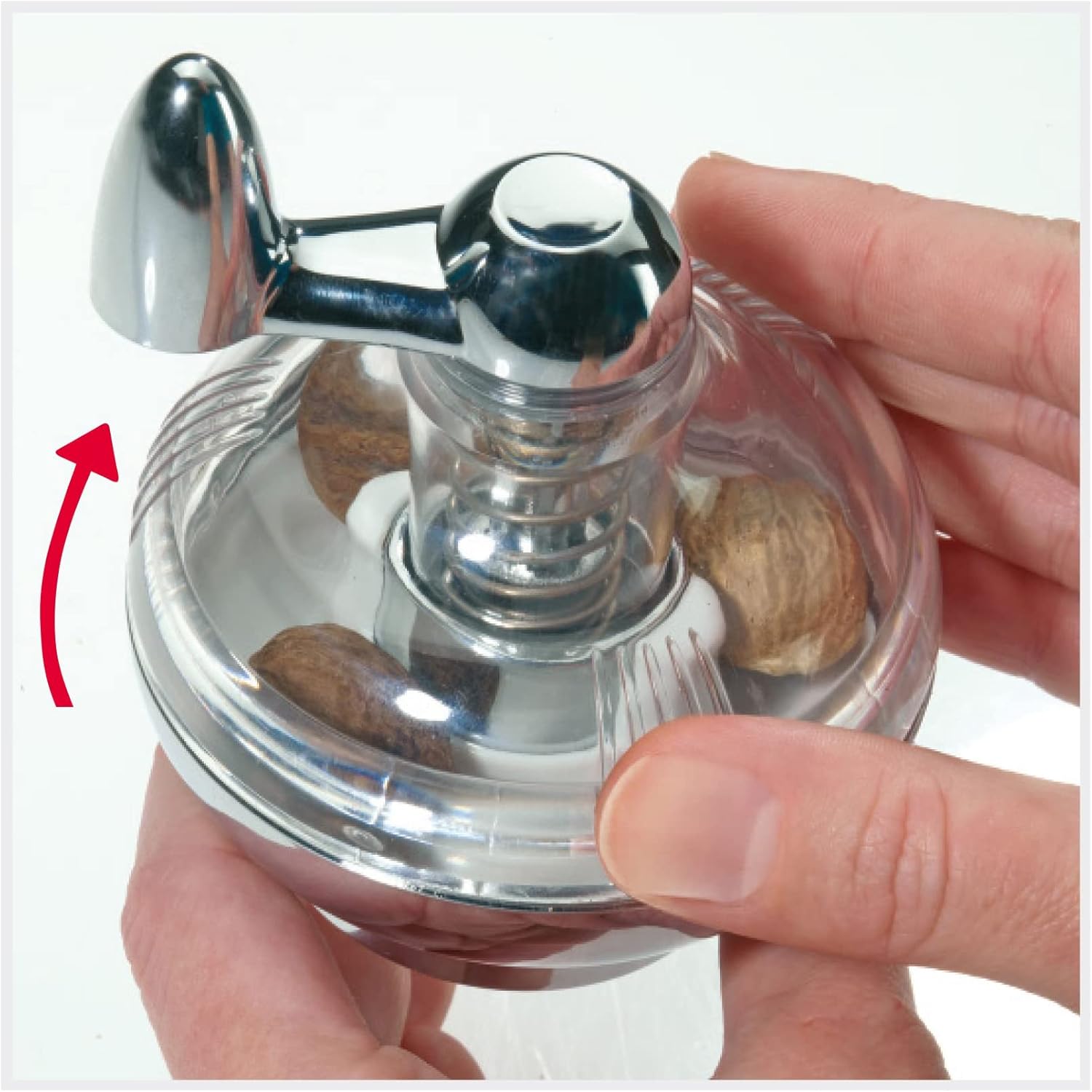 • 1 transparente, kugelförmige Mühle mit Vorratsfläche und Kurbel, zum Mahlen von ganzen Muskatnüssen, gleichmässiger Abrieb durch sich selbst regulierenden Federmechanismus, Messereinheit aus rostfreiem Edelstahl