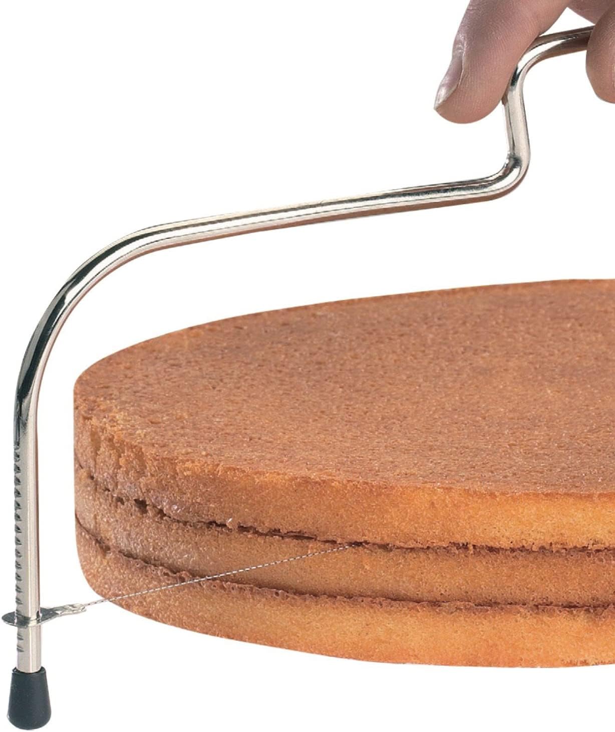 • 1 klassischer Tortenbodenteiler mit einem Schneiddraht zum gleichmässigen Schneiden von Kuchen- und Tortenböden aus Biscuit- oder Rührteig sowie Wiener Boden