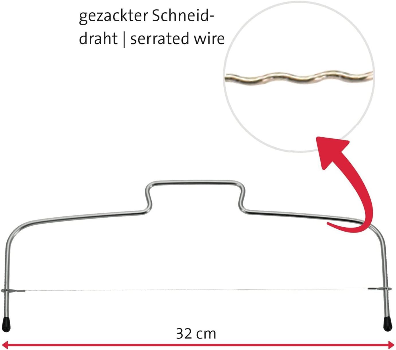 • Müheloses und gleichmässiges Schneiden von Teigböden in mindestens 2 Teile dank einem straff gespannten, gezahnten Draht aus rostfreiem Edelstahl, einfache Höhenverstellung des Drahtes durch Verschieben