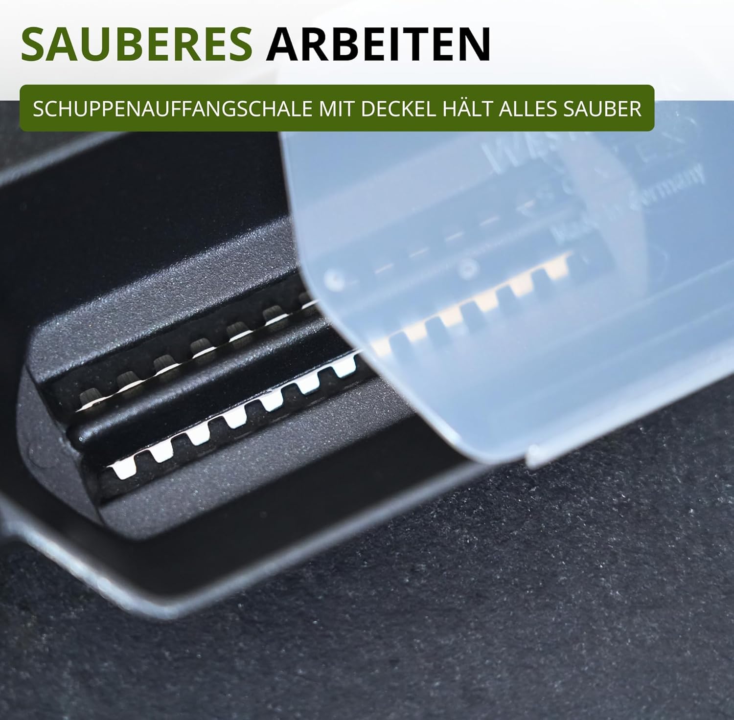 - PRAKTISCHE SCHUPPENFÄNGER-FUNKTION – Die spezielle Form fängt gelöste Schuppen auf und sorgt für eine saubere Arbeitsfläche. Der Entschupper überzeugt durch eine hochwertige Verarbeitung aus Aluminium & Edelstahl.