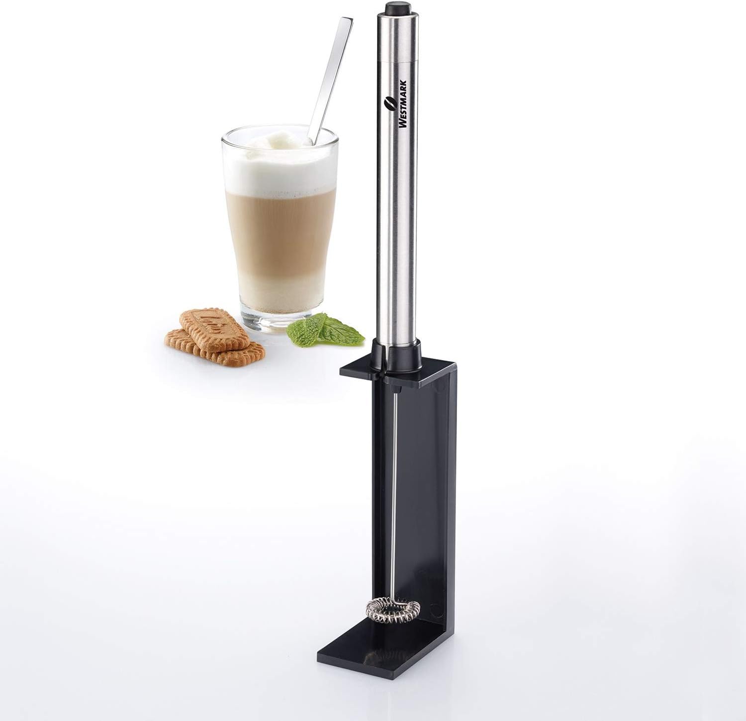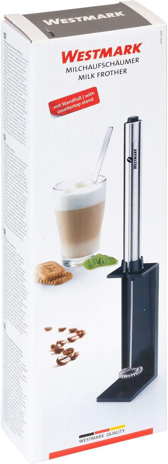- Lieferumfang: 1x Westmark Elektrischer Milchaufschäumer, Brasilia, Abmessungen: 24,8 x 16 x 16 cm, Gewicht: 102 Gramm, Material: 18/8 Rostfreier Edelstahl/Halterung aus Kunststoff (ABS), Farbe: Silber/Schwarz, 24762260