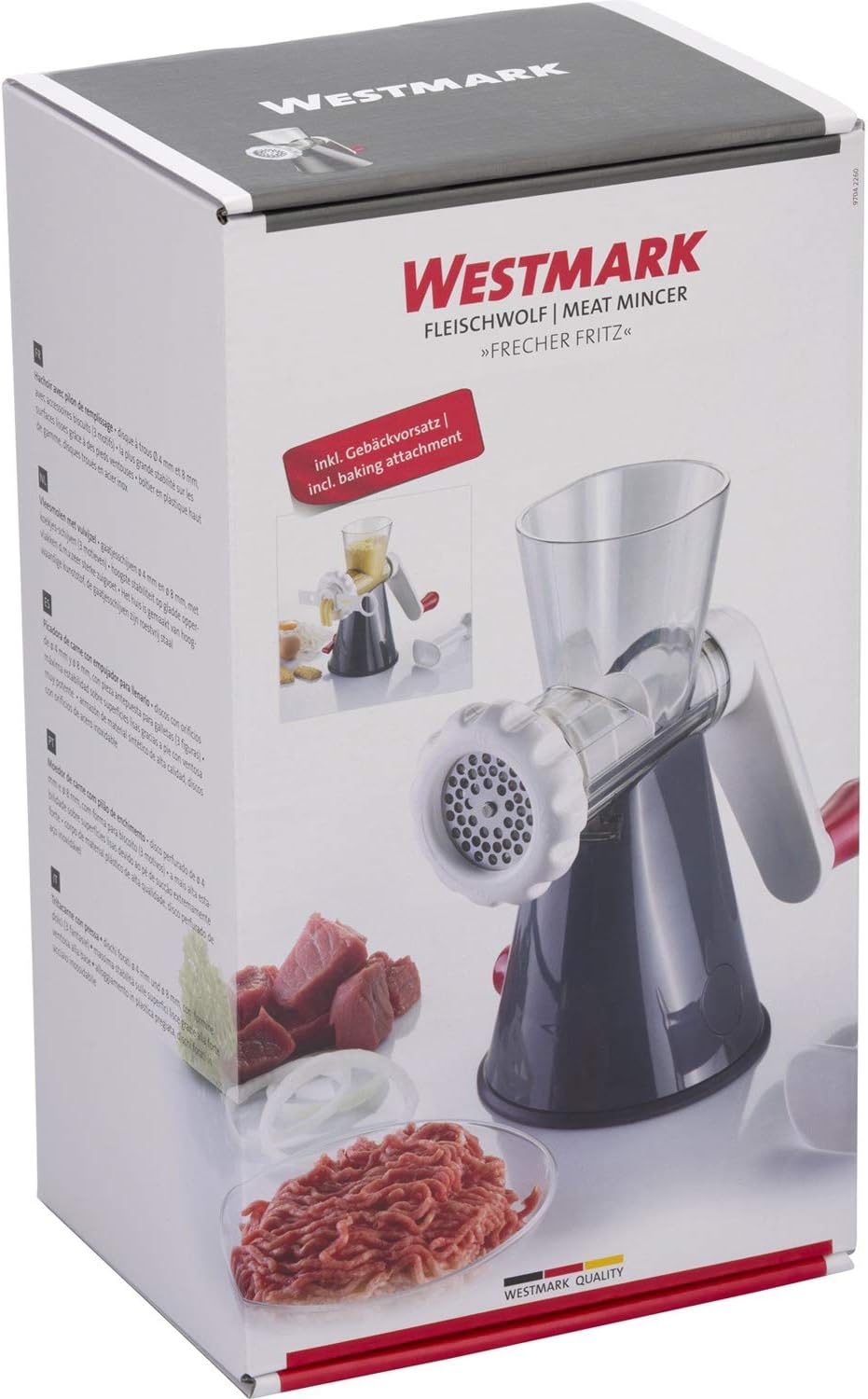 - Lieferumfang: 1x Westmark Fleischwolf, Frecher Fritz, Inkl. 2 verschiedenen Lochscheiben, 1 Gebäckvorsatz und 1 Füllstössel, Mit Verpackung, Material: Kunststoff (ABS, PP, SAN,POM) /Rostfreier Edelstahl, Masse: 24 x 13 x 24,5 cm, Farbe: