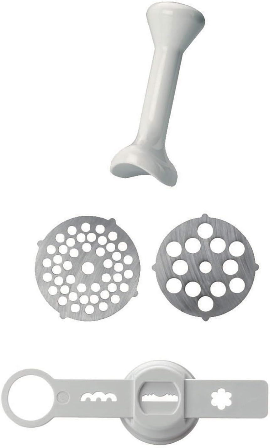 - Scharfes 4-flügeliges Messer aus rostfreiem Edelstahl und Förderschnecke aus Kunststoff für frisches Hackfleisch, Brät oder Gebäck, mit 2 Lochscheiben (Lochungs-Ø: 4 und 8 mm), inklusive Gebäckvorsatz