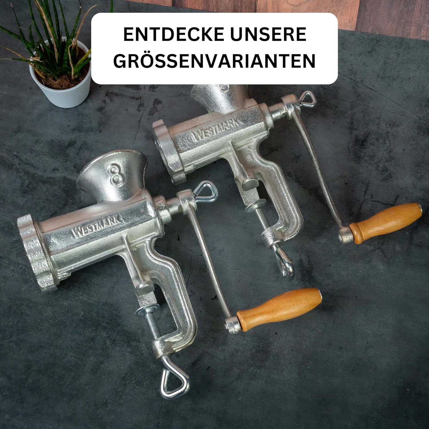 - Lieferumfang: 1 x Westmark Fleischwolf-Set, 2tlg.: bestehend aus je 1x Fleischwolf + 1x Spritzgebäckvorsatz, Grösse 8, 5 Jahre Garantie, Material: Verzinnter Stahlguss/Rostfreier Edelstahl/Holz, Masse: 25x10x26,5 cm, Gewicht: 2085 g, Farbe: Silber, 975222E6