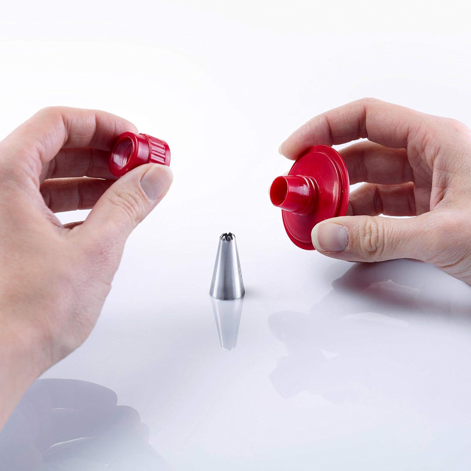 • Einfache Handhabung: Einfaches Einsetzen der Formscheiben oder der Spritztüllen (hierfür gibt es einen Adapter)