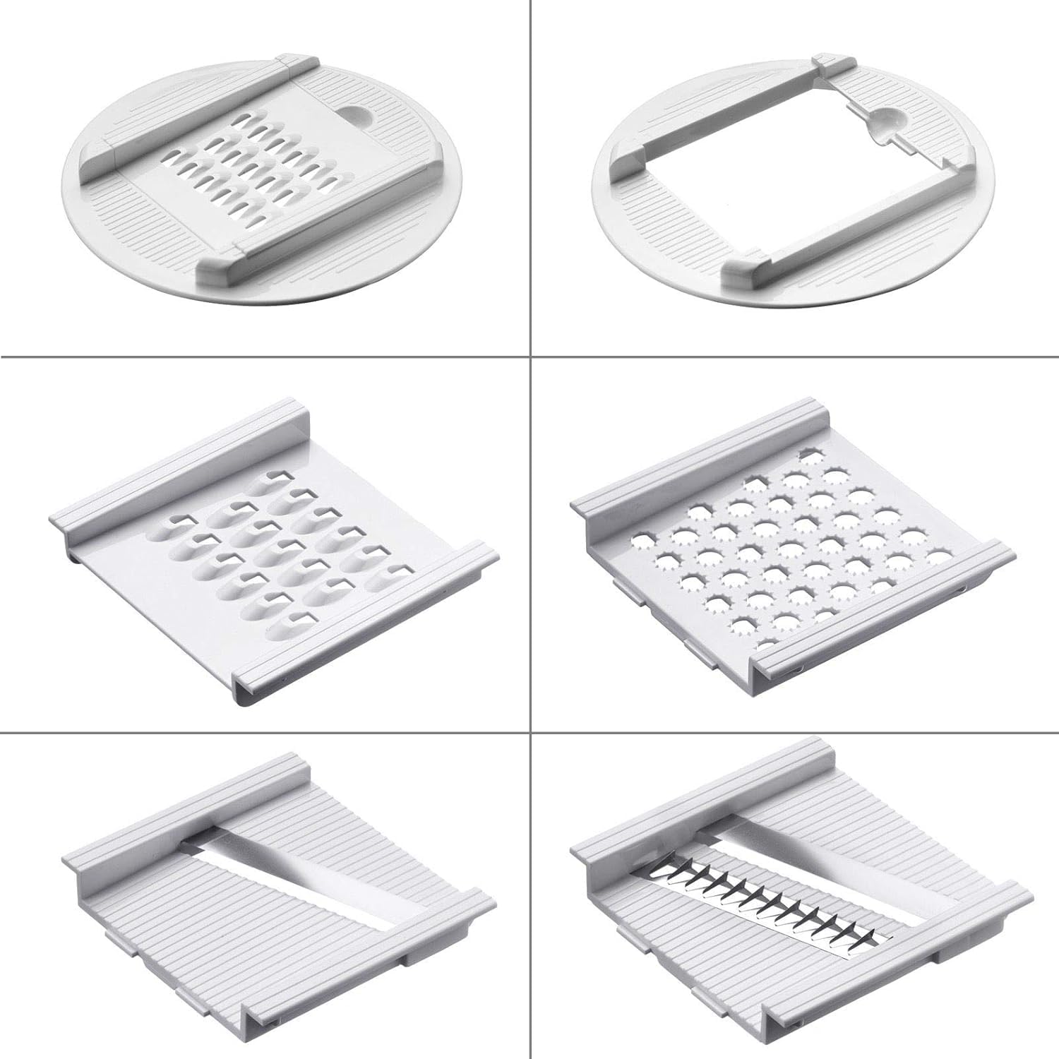 - 1. Schneidmesser-Einsatz mit 3 scharfen glatten und gezahnten Klingen zum Zerkleinern/Hacken; 2. 2 Saftpresskegel zum Entsaften; 3.-7. Kronenreibe, Rohkostraspel, Hobel und Julienneschneider mit Restehalter zur Verarbeitung von Obst und Gemüse