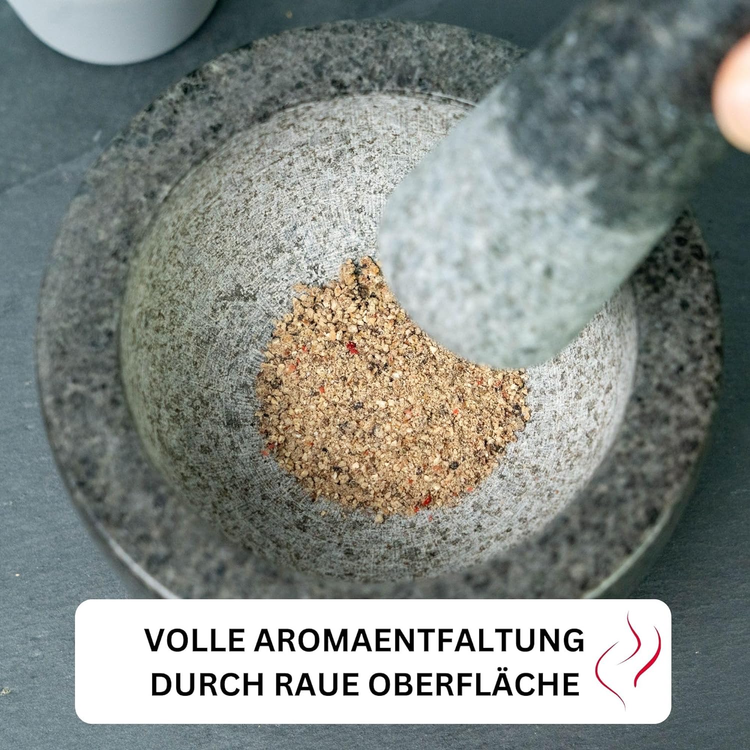 - Müheloses Zerkleinern und Zubereiten von würzigen Pasten und Marinaden mit voller Aromaentfaltung dank rauer Mörserinnen- und Stösselunterseite