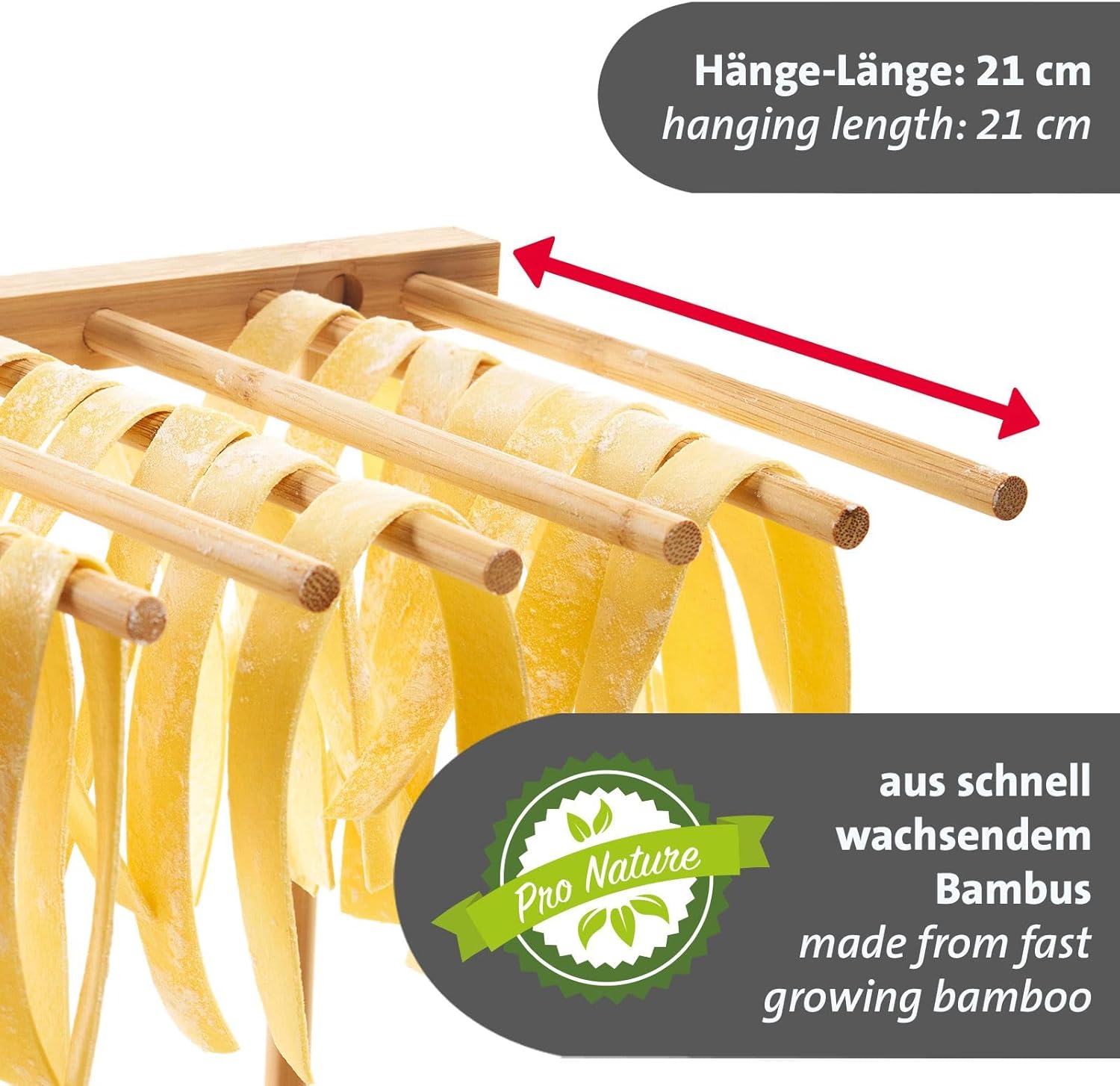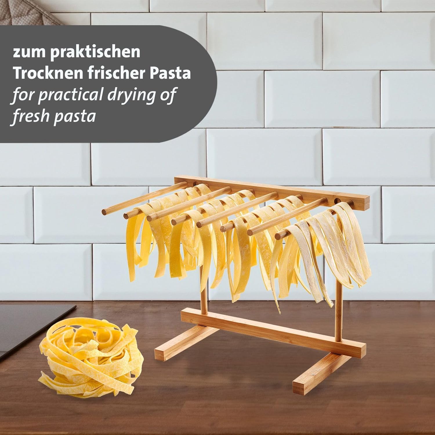 • SICHER – Der Bambus des Trockenständers ist mit einer lebensmittelechten Spezialbeschichtung versehen, die eine hygienische Verwendung gewährleistet und Ihre selbstgemachte Pasta unverfälscht hält.
