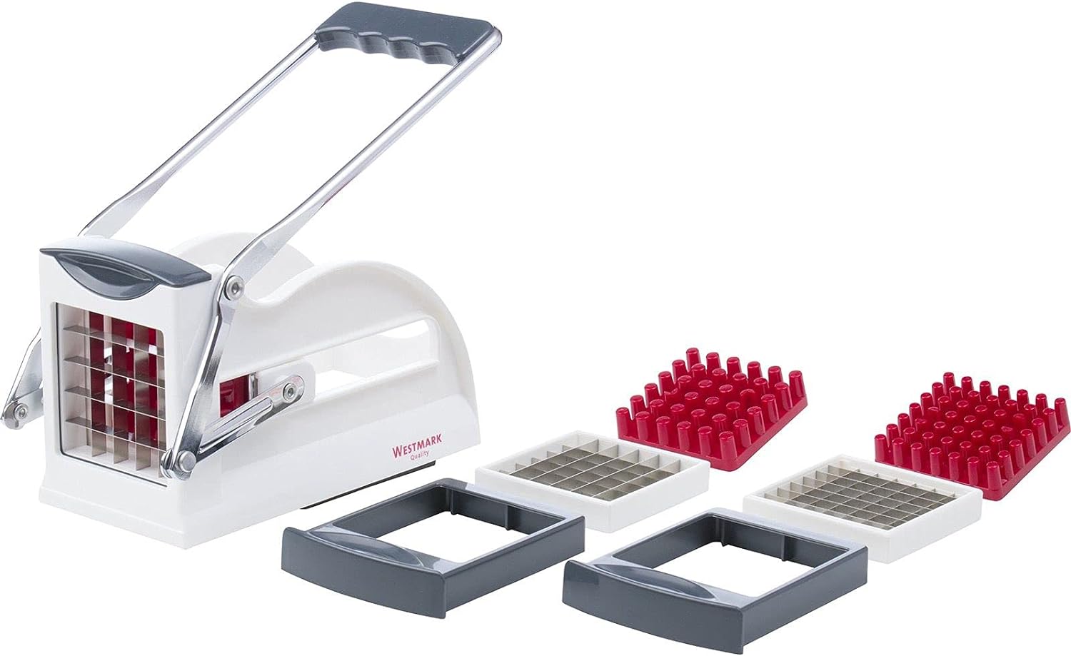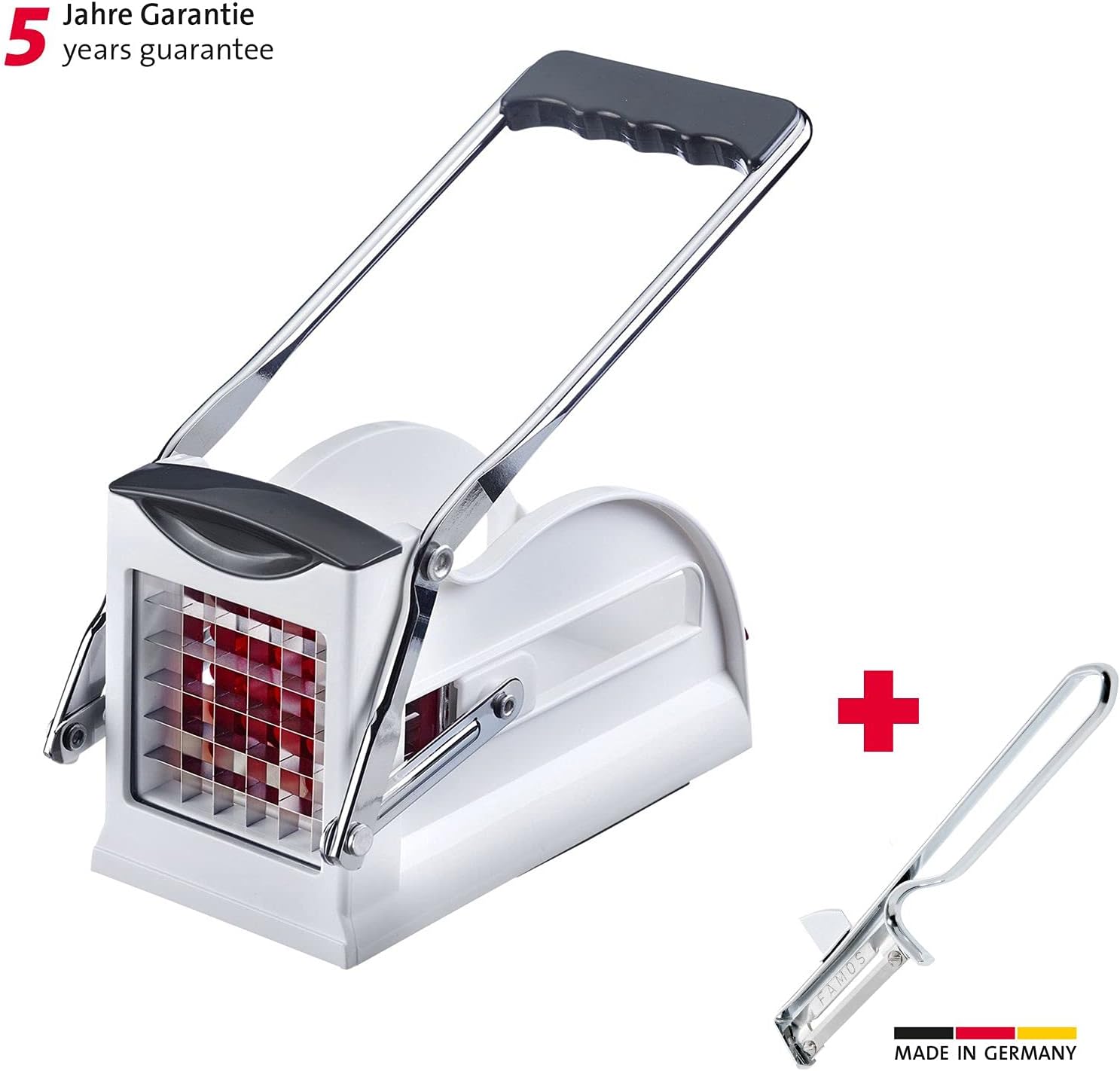 • Lieferumfang: 1 x Westmark Pommes frites Schneider Easy Stix, Masse: 24 x 8,5 x 11 cm und 1 Sparschäler Famos, 15,7 x 4,1 x 0,7 cm, 5 Jahre Garantie, Material: Edelstahl, Stahl, Kunststoff (ABS, PP, TPE), 118022E7