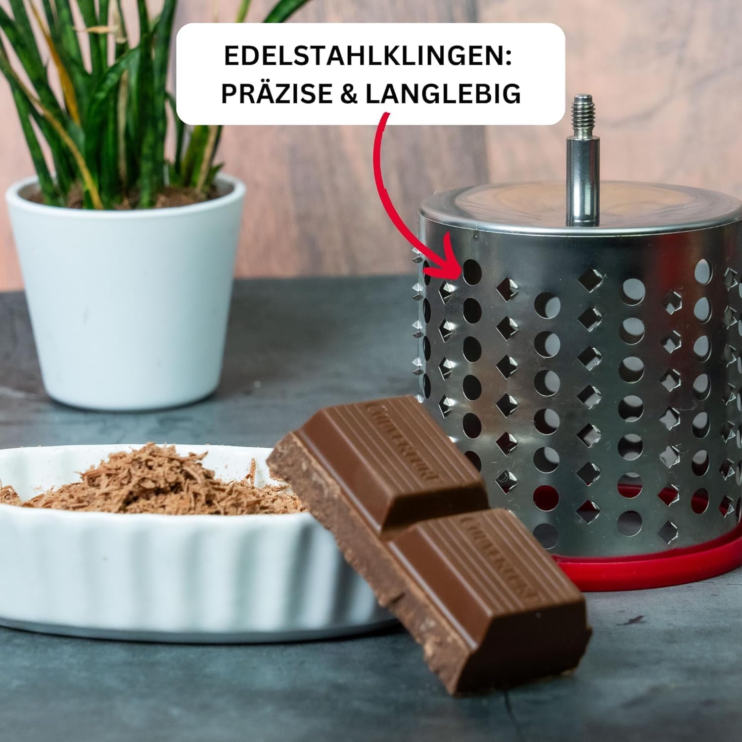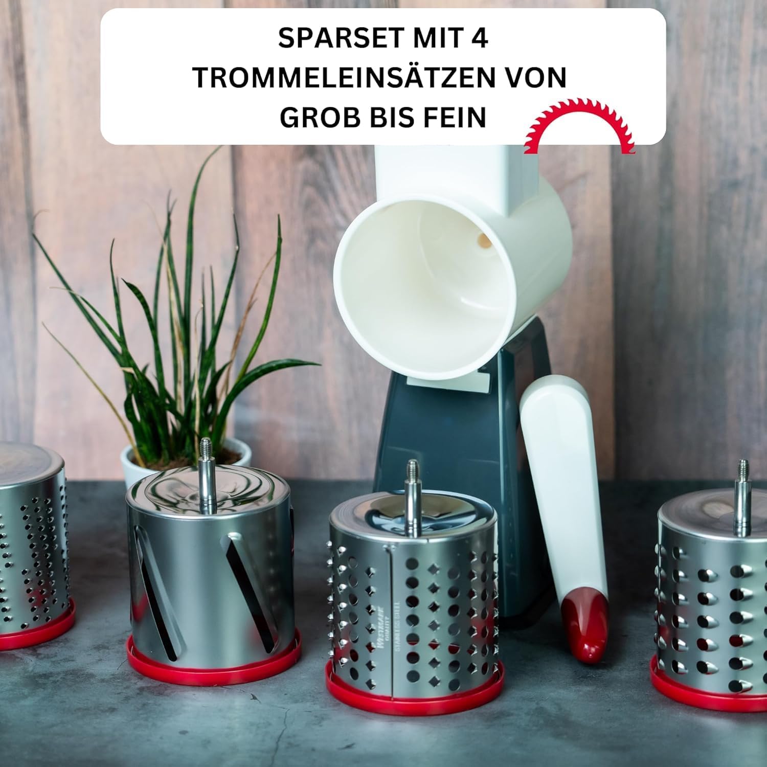 - Reibemaschine mit 4 Trommeleinsätzen zum groben, mittleren und feinen Reiben sowie zum Hobeln, geeignet für Obst, Gemüse, Käse, Nüsse und Schokolade
