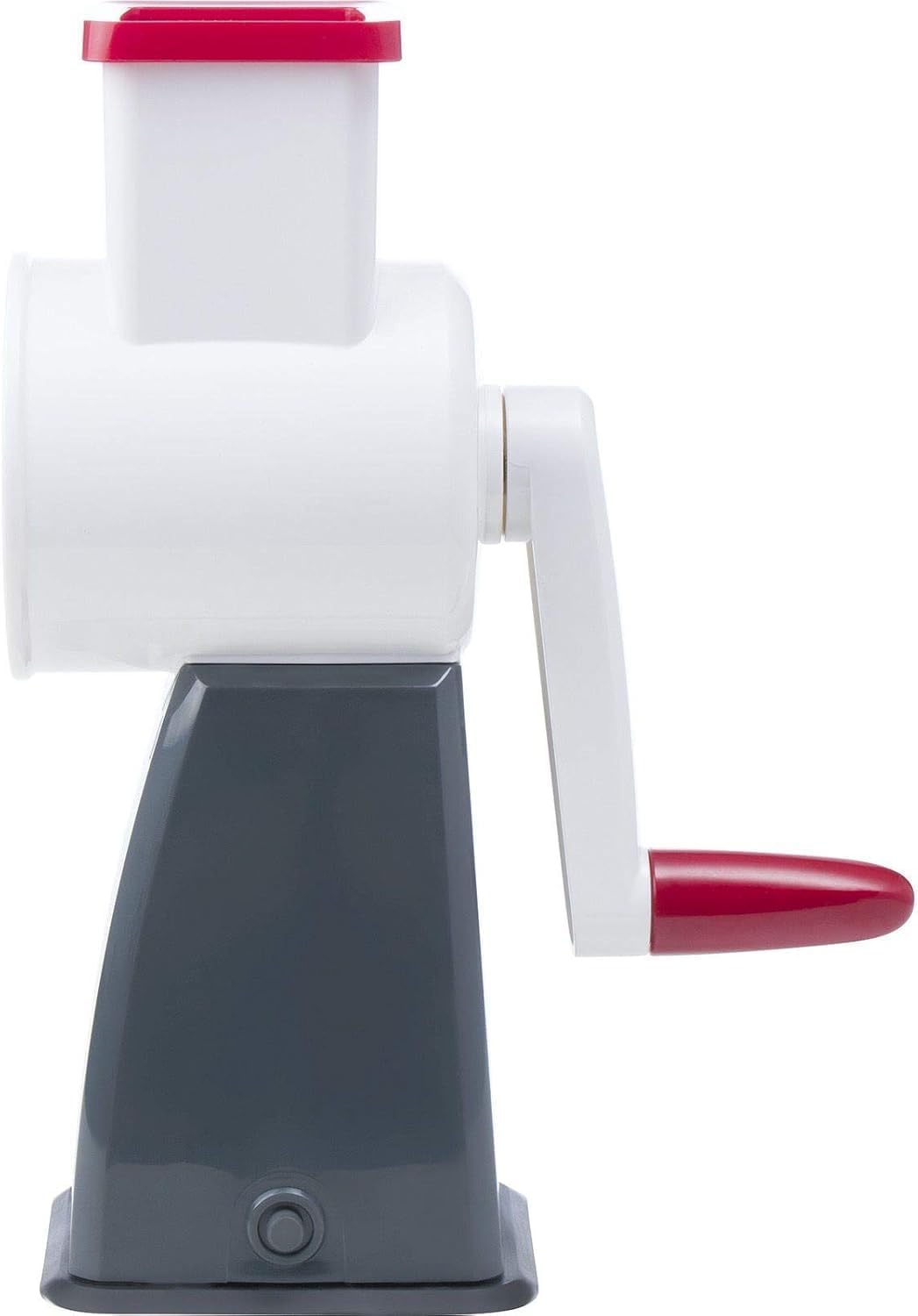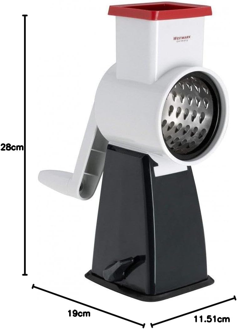 - Lieferumfang: 1x Westmark Reibemaschine mit 4 Schneidtrommeln, Trommelreibe/-hobel, Mit Verpackung, Masse: 19 x 28 x 11,5 cm, Gewicht: 850 Gramm, Material: Kunststoff (ABS)/Rostfreier Edelstahl, Farbe: Weiss/Silber/Schwarz/Rot, 97602260