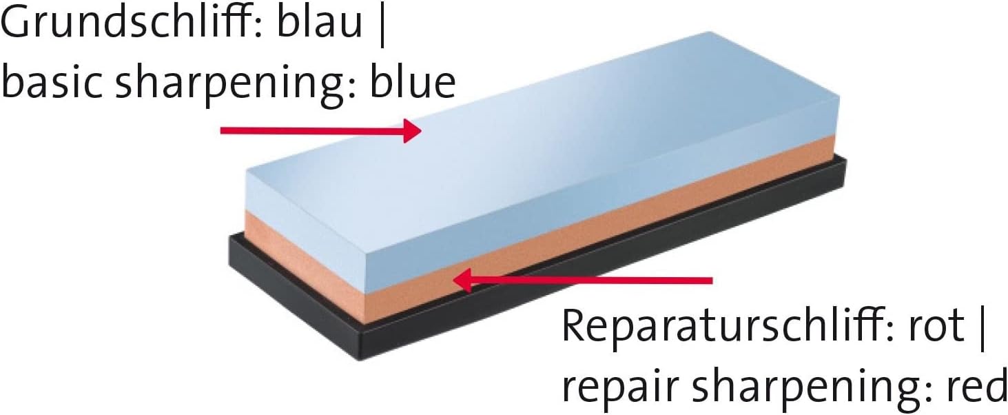 - Lieferumfang: 1x Westmark Schleifstein, 5 Jahre Garantie, Material: Korund, Masse: 18,5 x 6,7 x 3,1 cm, Gewicht: 656 Gramm, Farbe: Rot/Blau, 10152260