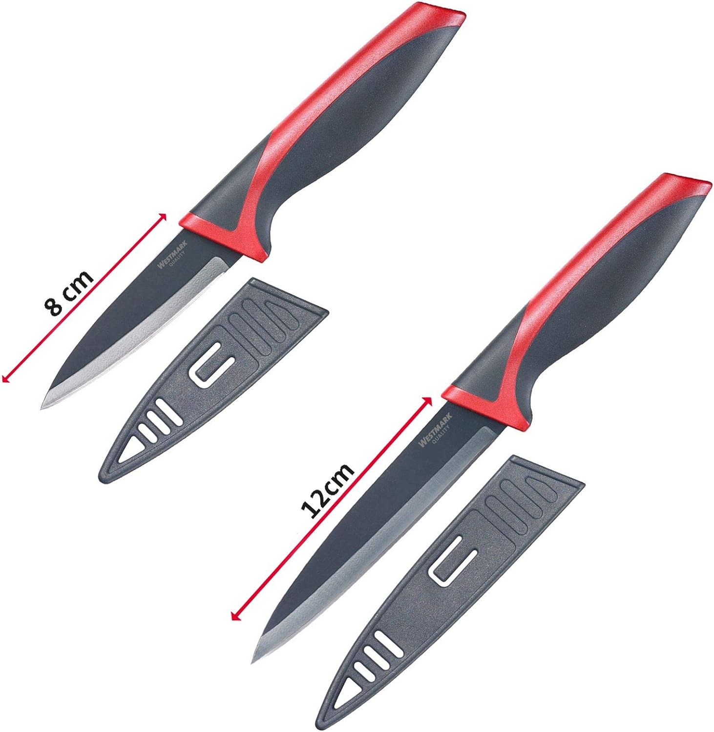 - Lieferumfang: 1 x Westmark Küchenhelfer-Set, 5tlg., 5 Jahre Garantie, Inhalt: je 1x Schneidbrett, Chefmesser, Brotmesser, Allzweckmesser und Schälmesser, Material: Kunststoff (PP/TPE)/Edelstahl, Farbe: anthrazit/rot, 145222E6