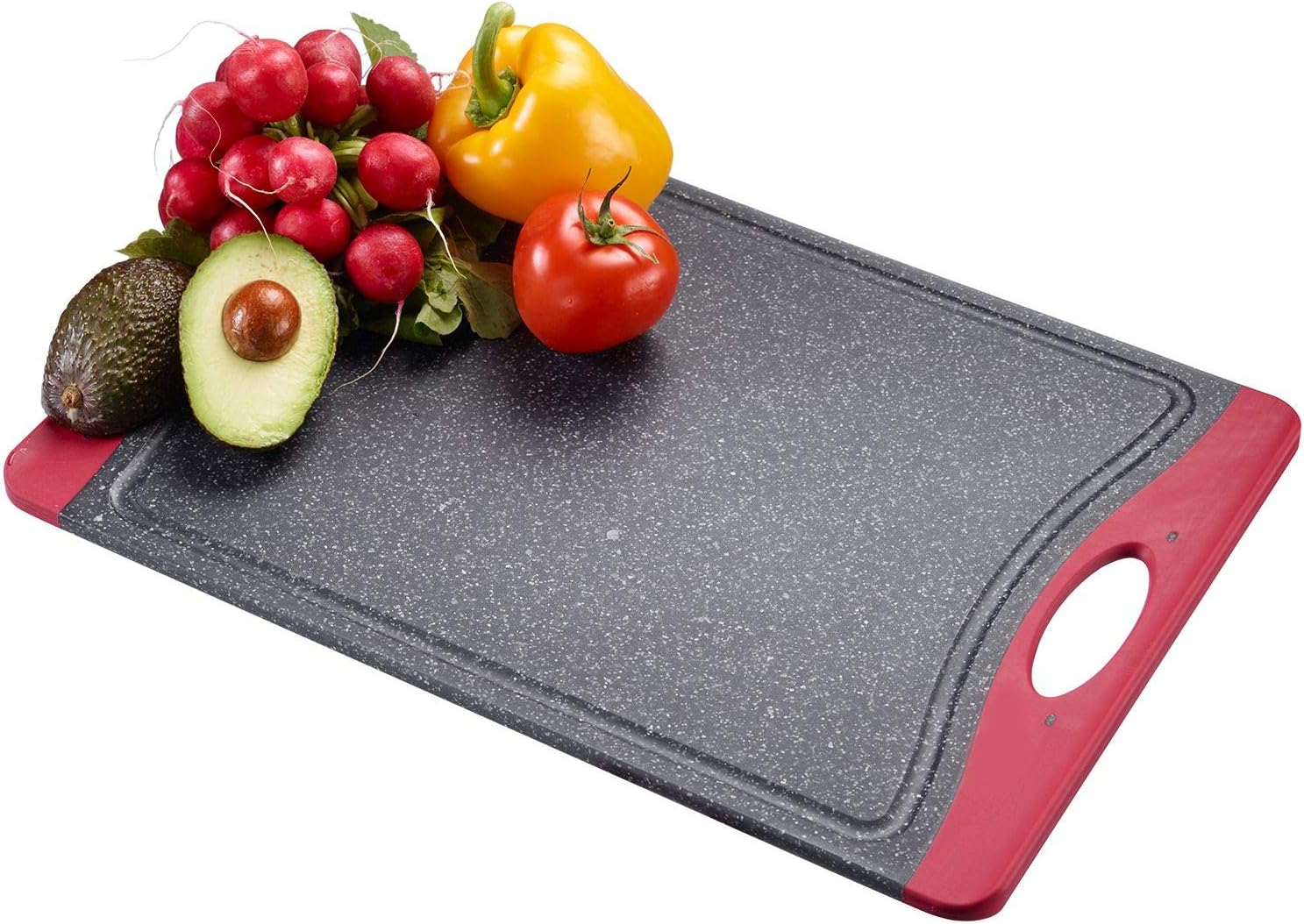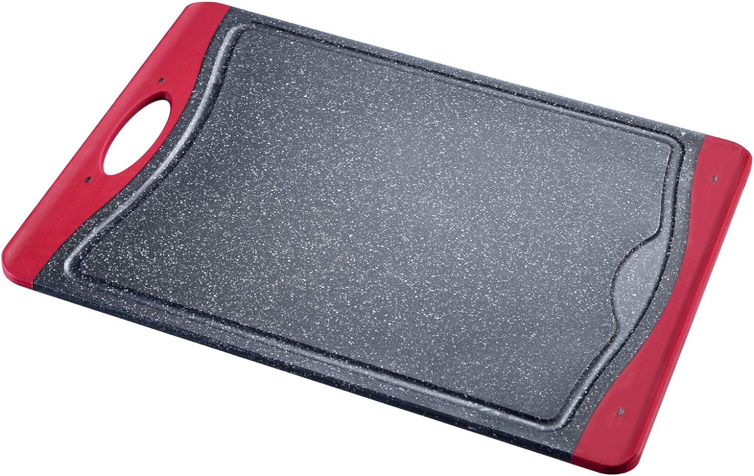 - Schneidbrett mit umlaufender Saftrille, rote Randelemente aus rutschfestem Material sorgen für sicheres Aufliegen auf der Arbeitsfläche