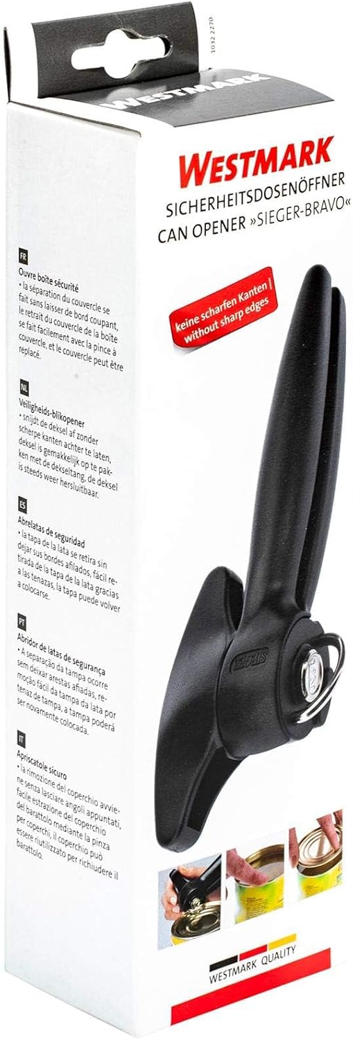 - Lieferumfang: 1x Westmark Sicherheitsdosenöffner, Bravo, 5 Jahre Garantie, Masse: 18,5 x 8 x 4,2 cm, Material: Rostfreier Edelstahl/Kunststoff (ABS), Farbe: Schwarz, 10322270
