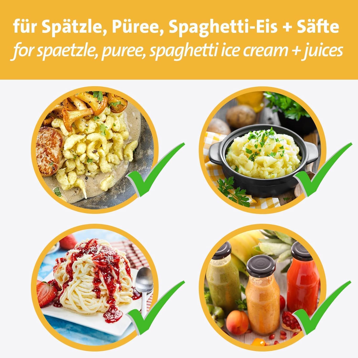 - Klassische Spätzlepresse mit runder Lochung, zum Herstellen von Spätzle, Kartoffelpüree, Spaghetti-Eis oder Obstsäfte