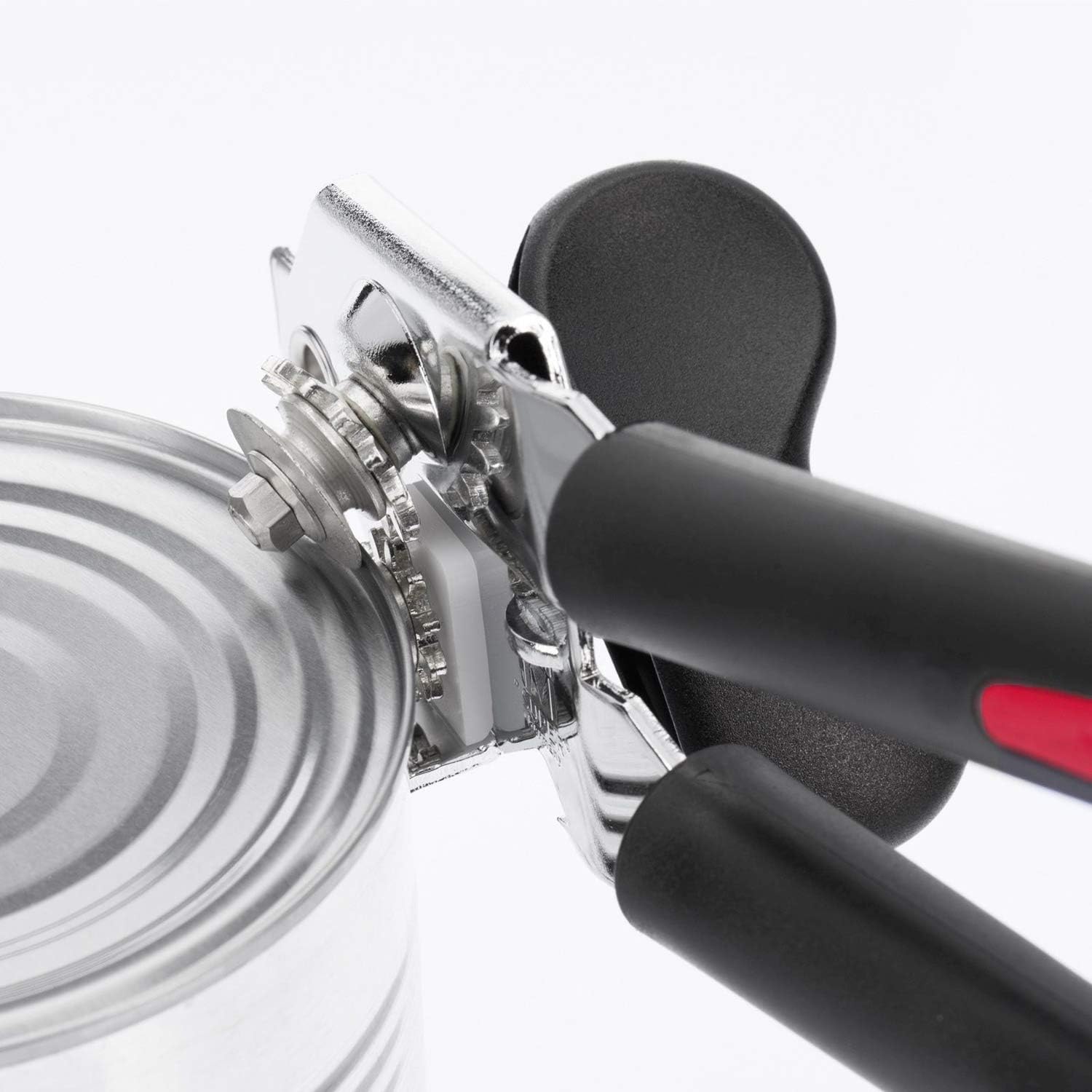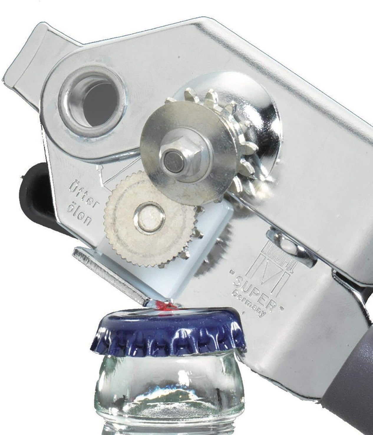 - Vorteil: Komfortables Ansetzen am Dosenrand durch vollständig zu öffnende Zange, sicheres und schnelles Aufschneiden von Konservendosen jeder Grösse und Stärke, Schneidrollen-Prinzip, gehärtetes Schneidrad wird durch zwei gefederte Zahnräder
