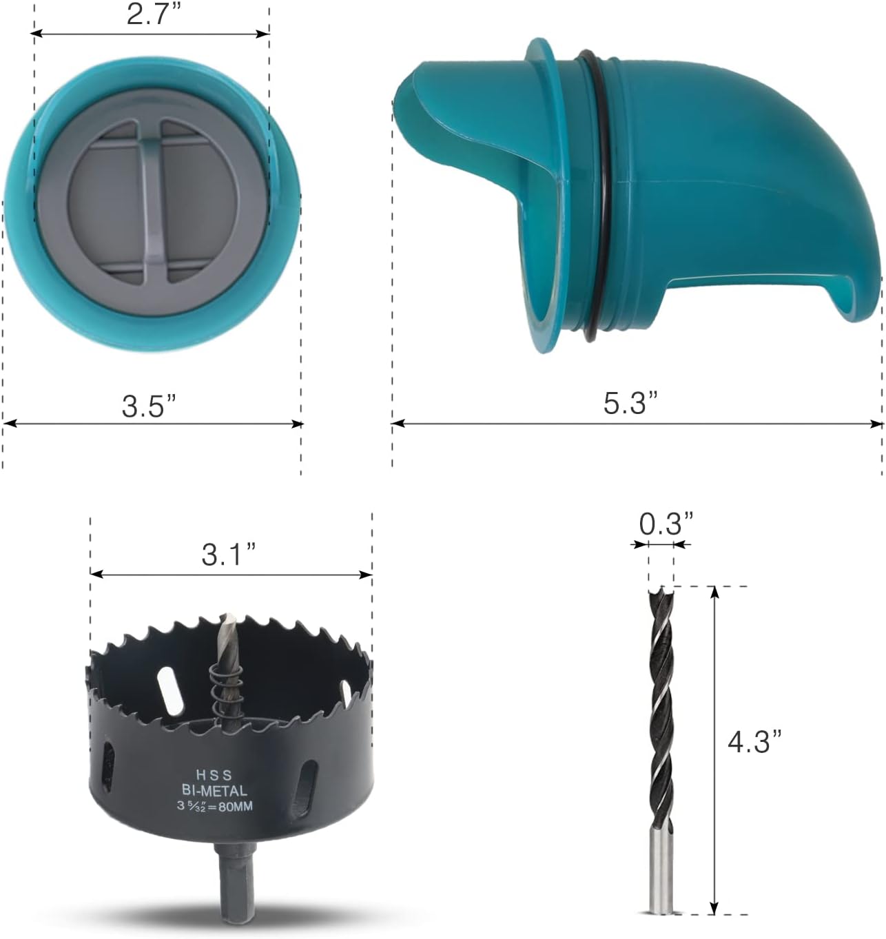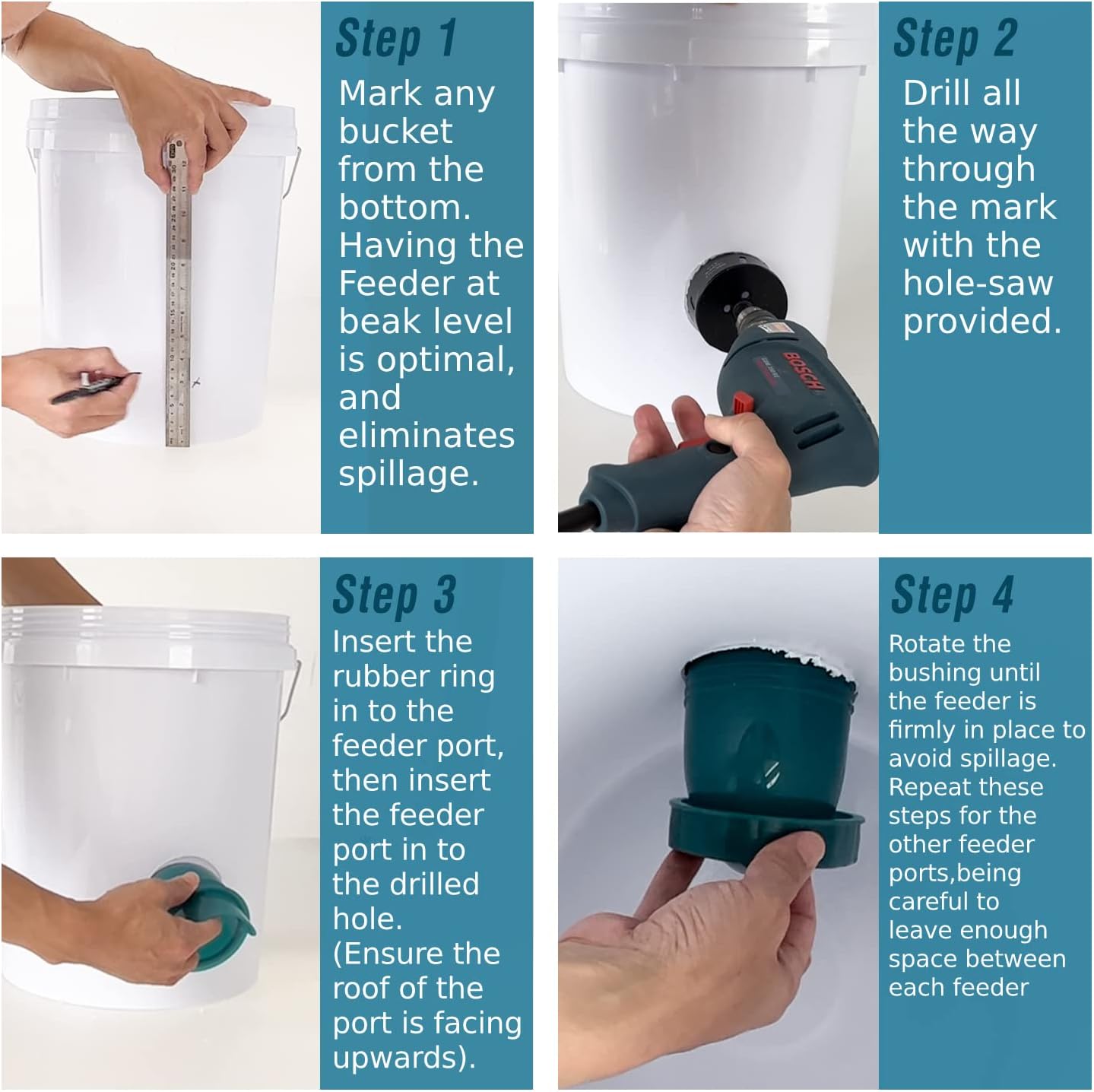 • Einfach: Markieren Sie einfach jeden Behälter 7,6 cm von unten, bohren Sie mit der mitgelieferten Lochsäge durch die Markierung und Ihr Set! Wichtig: Der Futteranschluss auf Schnabelhöhe mit Ihrem Geflügel ist optimal und verhindert Verschütten.