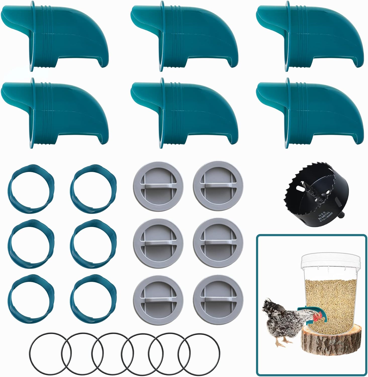 Whimsii Hühnerfutterspender ohne Abfall, 6 Anschlüsse + Lochsäge, Automatischer Hühnerfutterspender,