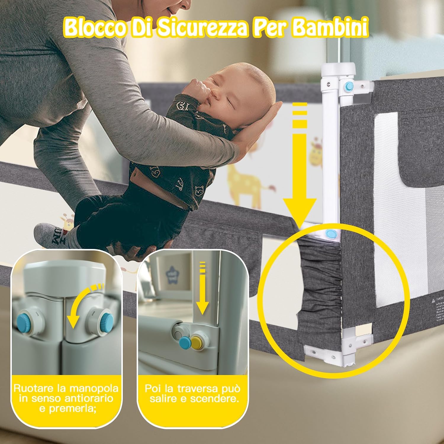 - Kindersicheres Verriegeln: Durch Drücken des blauen Knopfes kann diese Sicherheitsstange angehoben und abgesenkt werden, einfach zu bedienen. Durch Drehen des Knopfes, um den Schutz zu sperren, um Ihr Baby sicherer zu halten.