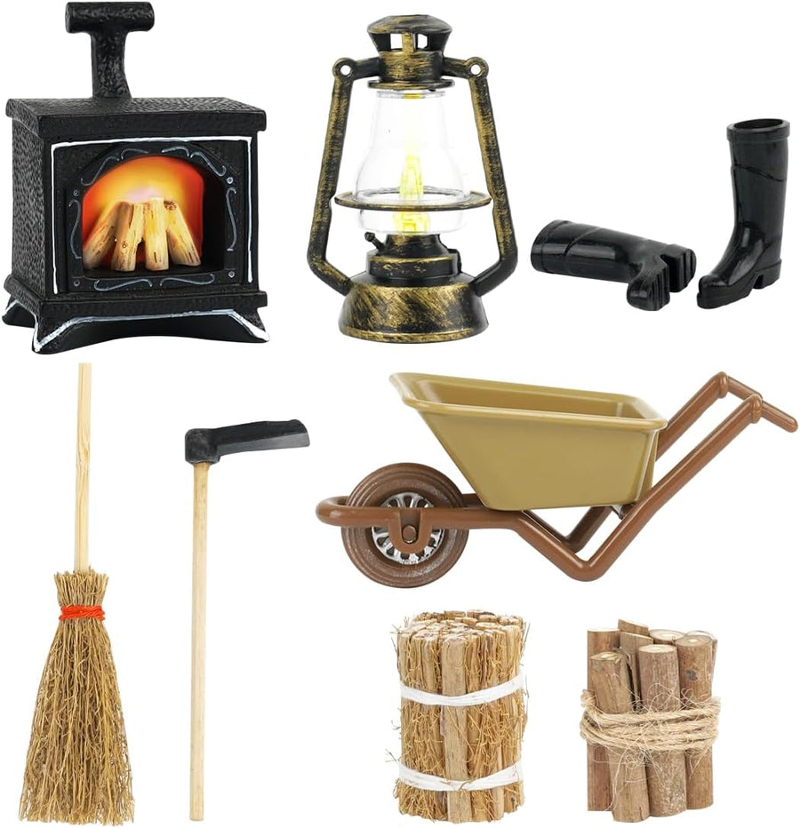 • 【Wichtel Zubehör Set】: Miniatur Zubehör Set beinhaltet 1 Wichtel Kamin Set, 1 Hacke, 1 Besen, 1 Paar Regenstiefel, 1 Karren, 1 Bündel Holz, 1 Bündel Heu und ist für Puppenhäuser oder Puppen im Massstab 1:12 geeignet.