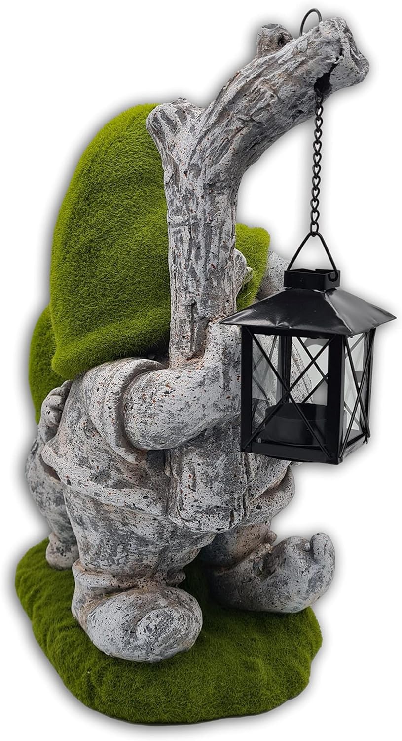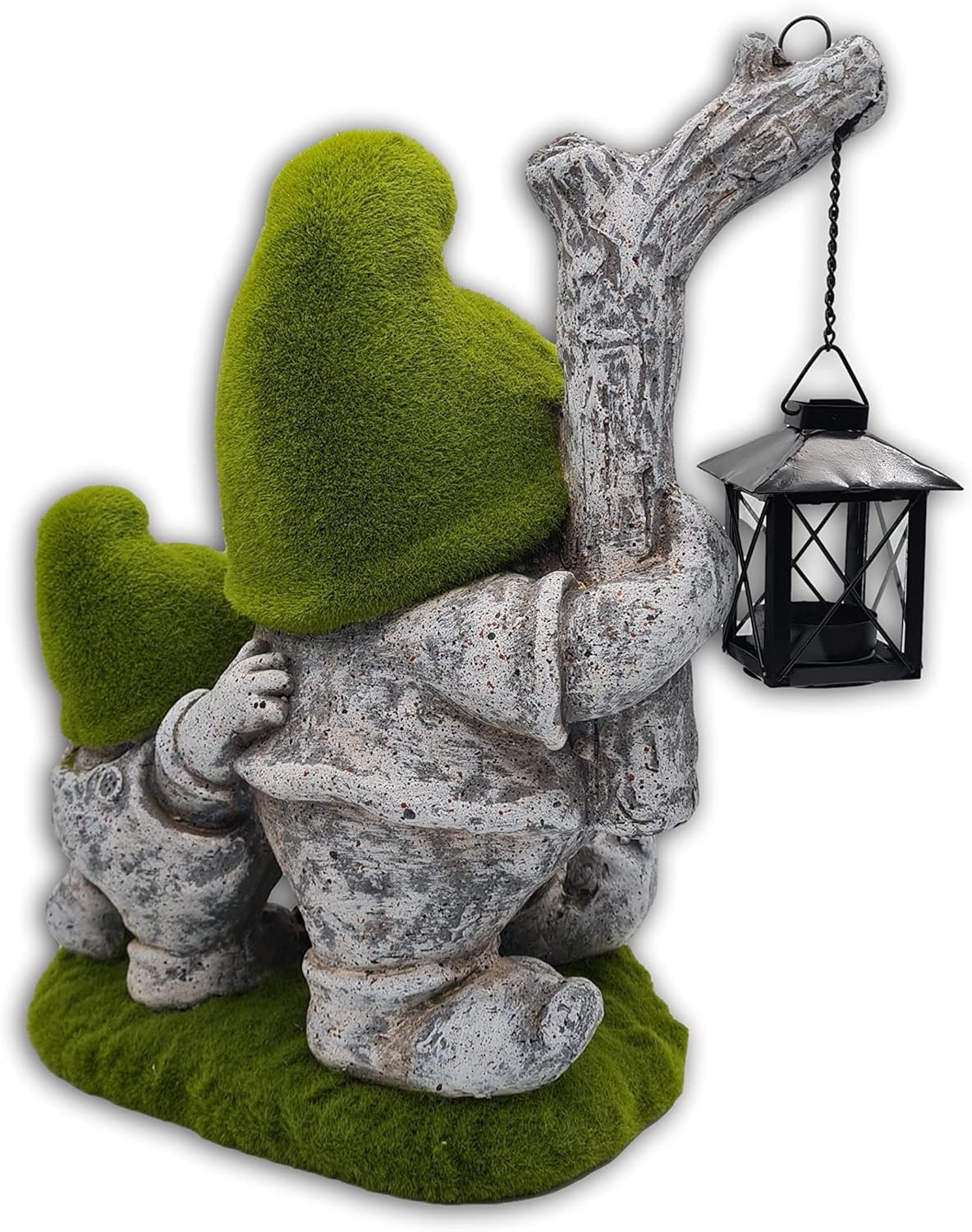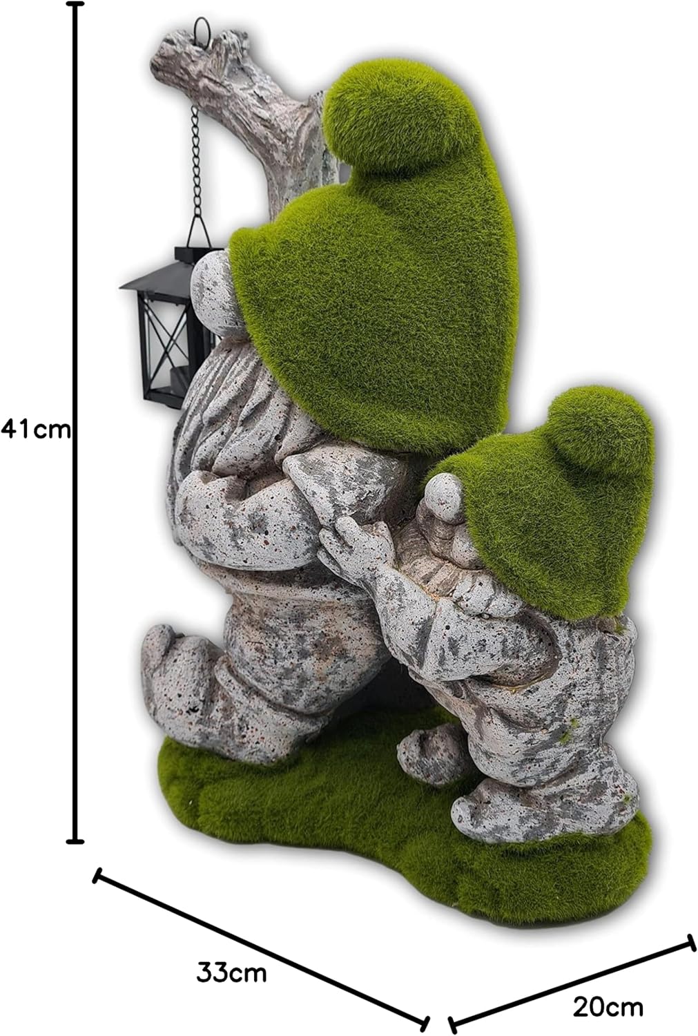 - Masse: ca. 20 x 33 x 41 cm, Material: Polyresin. Die Wichtel für den Garten mit ihren Mooszipfelmützen machen eine Nachtwanderung und die am Wanderstock befestigte Laterne erleuchtet den Weg mit Hilfe eines Teelicht.