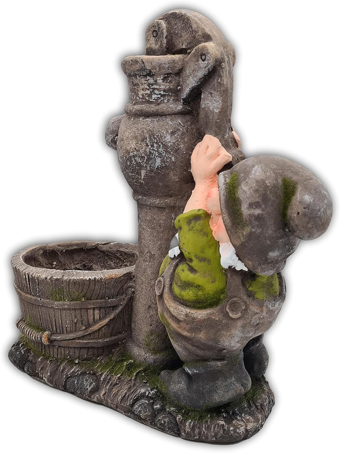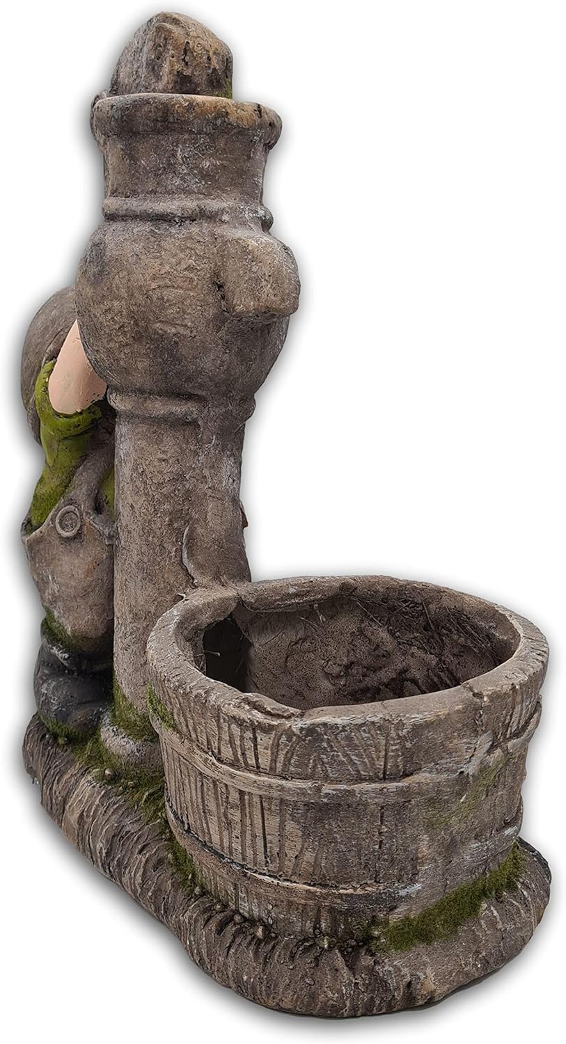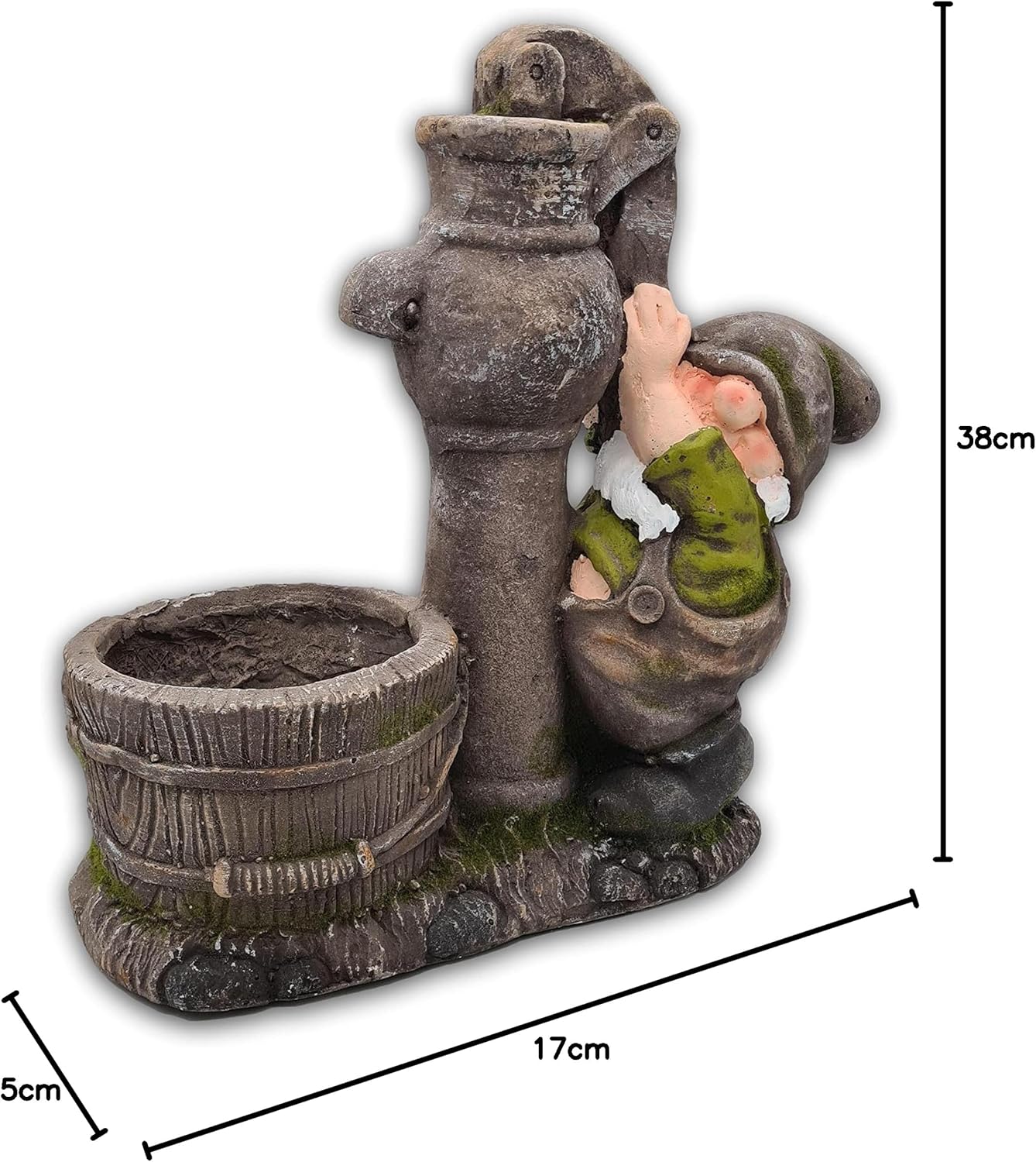 • Masse: ca. 37,5 x 17 x 38 cm, Material: Polyresin. Der kleine Wichtel pumpt Wasser in den bereitgestellten Trog, der sich wegen seiner Grösse gut mit eigenen Pflanzen dekorieren lässt und so für Abwechselung im Beet oder am Wegrand sorgt.