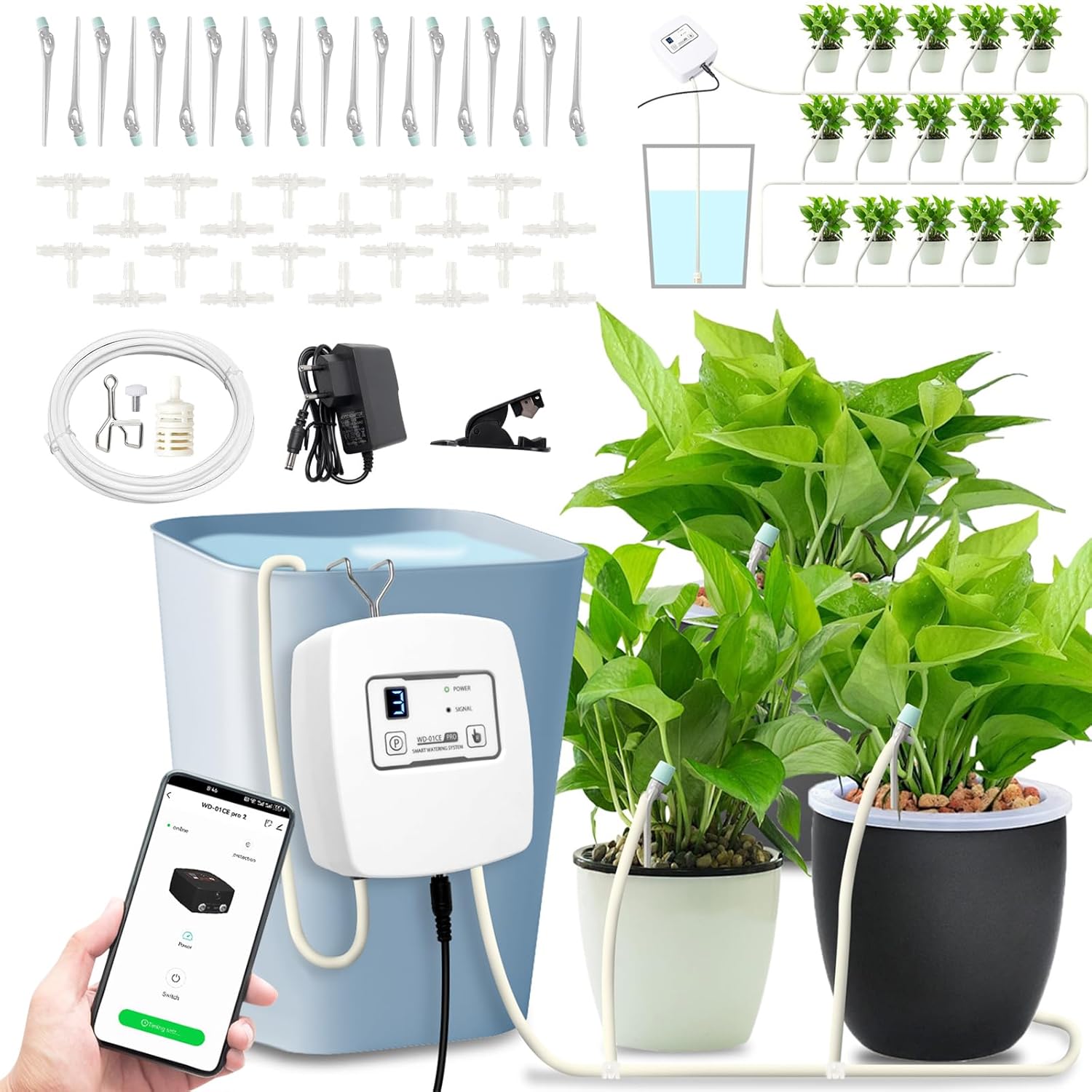 - Umfangreicher Zubehörsatz: Im Lieferumfang des automatischen Bewässerungssystems sind enthalten: Fester Haken 1pc, Rohrclipper 1pc, Benutzerhandbuch 6-Sprachen, Wifi-Host 1pc, Wasserrohr 15m, Filter 1pc, EU-Stecker 1pc, T-Stück 20pcs, justierbarer