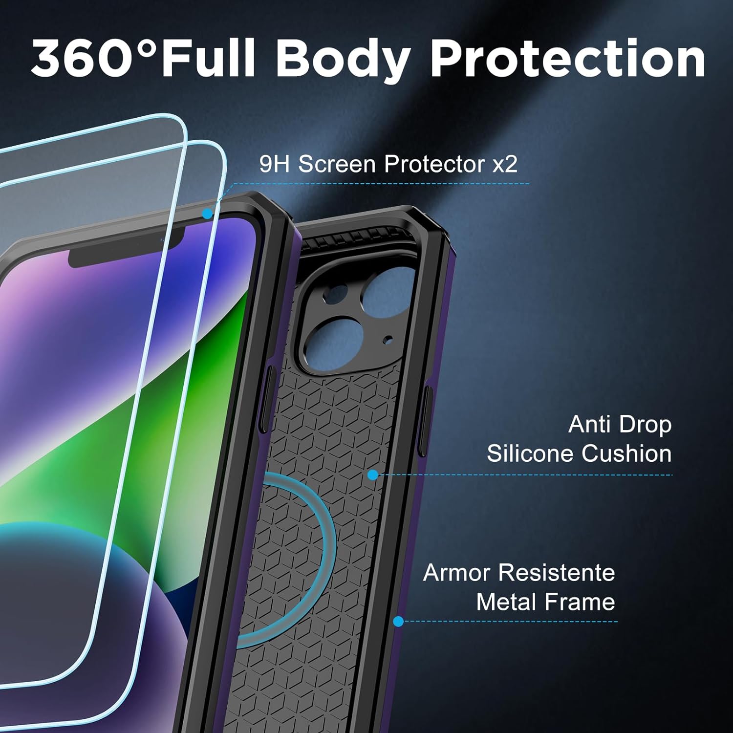 WIFORT Magnetisch Metall Hülle für iPhone 14 Plus Kompatibel mit MagSafe, mit 2 Stück Schutzglas, Mi