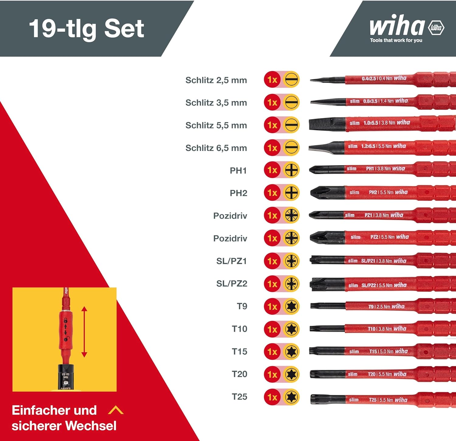 - Das slim Torque Starter Set von Wiha ist mit VDE Drehmoment, Bithalter und slimBits bestückt und besteht aus 18 Teilen. Das Komplettpaket für sicheres Arbeiten in einer praktischen Werkzeugtasche